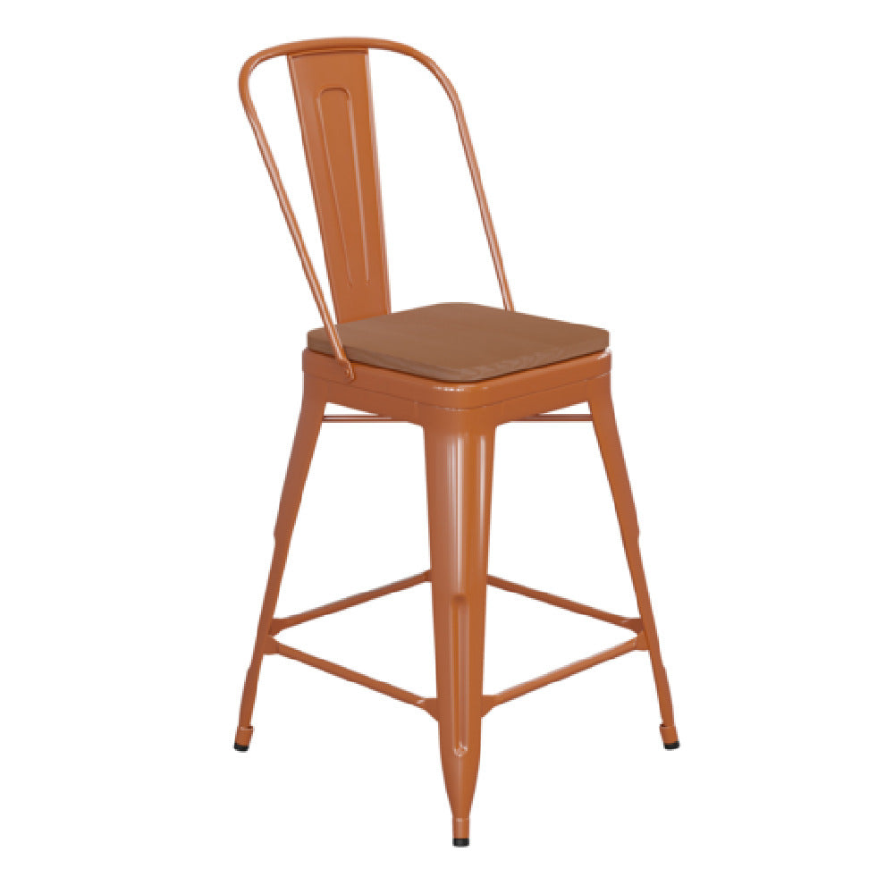 The Flash Furniture CH-31320-24GB-OR-PL2T-GG Kai Bar Stool 500 Lb. Weight Capacity is a versatile seating solution designed for both indoor and outdoor environments. This counter-height stool supports up to 500 lbs., providing exceptional durability and robustness. A curved back with a vertical slat ensures comfort and ergonomic support, while the teak poly resin seat adds a touch of elegance and resilience against various weather conditions. The stool's structure is reinforced with a cross brace under the seat, enhancing stability and strength. Constructed from galvanized steel, it boasts a powder coat finish that not only contributes to its stylish appearance but also protects against rust and corrosion. The integrated footrest offers additional comfort, making it ideal for prolonged use. Plastic floor glides are included to prevent scuffing or scratching on floors, preserving the integrity of your indoor or outdoor spaces. The stool comes in a vibrant orange color, adding a bold pop of color to any setting. Assembly is required to set up this stylish and functional bar stool. Its design and practical features make it suitable for various market segments, including hospitality, residential, and commercial settings, where durability and style are paramount.