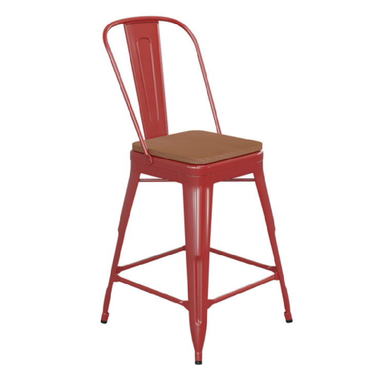 The Flash Furniture CH-31320-24GB-RED-PL2T-GG Kai Bar Stool stands out with its impressive 500 lb. weight capacity, catering to diverse markets that require durable seating solutions. This counter-height bar stool features a distinctive curved back with a vertical slat design, offering both style and ergonomic support. The seat is crafted from teak poly resin, known for its resilience and ease of maintenance, making it suitable for both indoor and outdoor environments. Enhanced stability is provided by the cross brace under the seat, constructed from galvanized steel, which is further protected by a powder coat finish. This robust construction ensures long-lasting durability and resistance to environmental elements. The inclusion of a convenient footrest enhances comfort for extended periods of sitting, while the plastic floor glides safeguard flooring surfaces from potential damage. Available in a vibrant red, this bar stool requires assembly, giving buyers the flexibility to assemble and place it according to their specific needs. The Flash Furniture Kai Bar Stool is a versatile choice for commercial establishments such as bars and cafes, as well as residential settings, offering a blend of aesthetic appeal and functional strength.