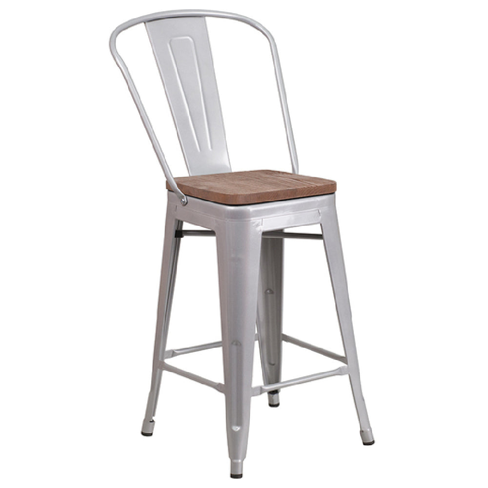 The Flash Furniture CH-31320-24GB-SIL-WD-GG Bar Stool stands out in the furniture market with its impressive 500 lb. weight capacity, making it a robust choice for a variety of settings, from home kitchens to commercial bistros. This counter height stool features a distinctive bistro style, highlighted by a metal curved back with a vertical slat, providing both aesthetic appeal and ergonomic support. The stool's textured wood seat adds a touch of elegance and comfort, while the cross brace underneath ensures additional stability, accommodating higher weight limits with ease. For added convenience, the stool includes a footrest, enhancing user comfort during extended periods of sitting. Its protective powder coat finish not only adds to the stool's visual appeal with a sleek silver color but also offers enhanced durability and resistance to wear and tear. Rubber floor glides protect flooring surfaces from scratches and allow for easy movement without causing damage. The stool's lightweight design facilitates effortless transport and repositioning, making it suitable for dynamic environments. Assembly is required, and with in-stock items typically shipping within 24 hours, this bar stool efficiently meets the needs of both residential and commercial markets, combining style, strength, and functionality.