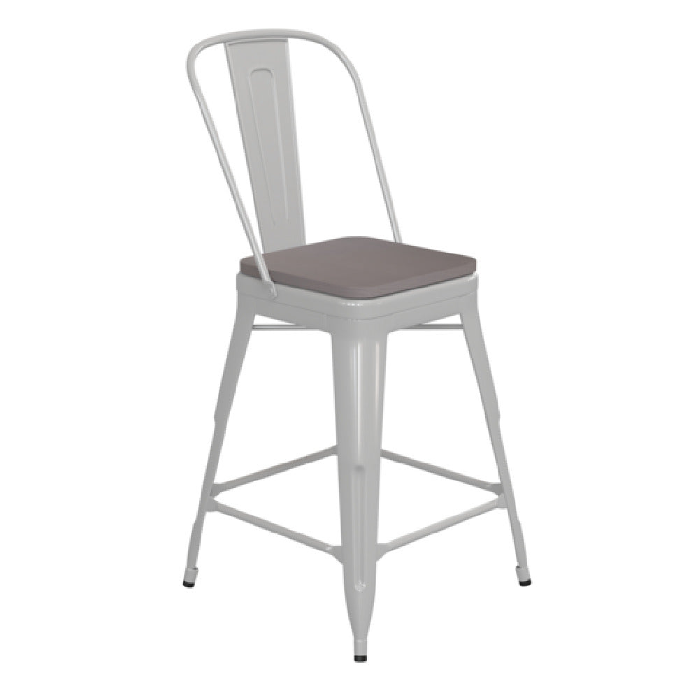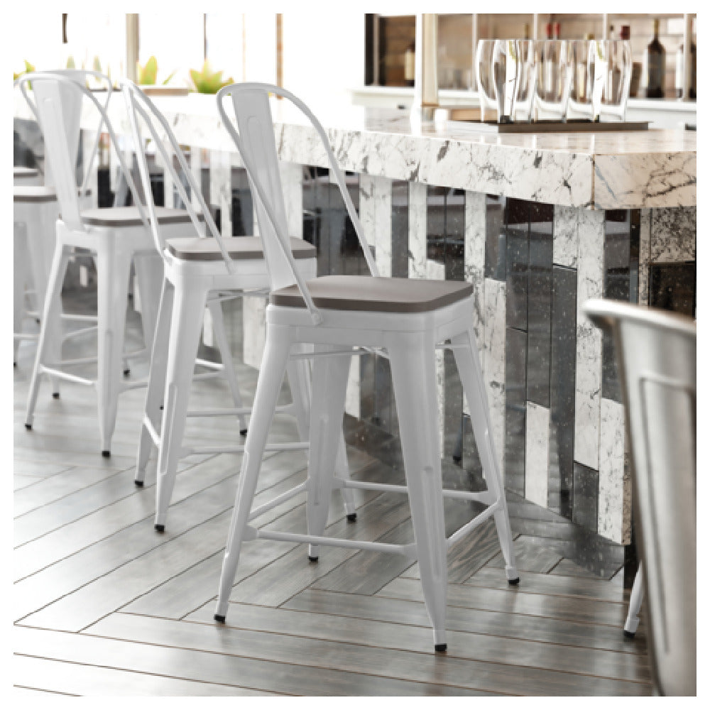 The Flash Furniture CH-31320-24GB-WH-PL2G-GG Kai Bar Stool is a versatile seating solution with a robust 500 lb weight capacity, perfect for various environments. This counter-height bar stool features a curved back with a vertical slat design, providing comfort and support. The seat is crafted from gray poly resin, offering durability and an easy-to-clean surface. Below the seat, a cross brace adds stability and strength, making it suitable for heavy use. Constructed from galvanized steel with a powder coat finish, the stool is designed for lasting use and can withstand both indoor and outdoor conditions. The integrated footrest adds to user comfort, while plastic floor glides protect your flooring from scratches. With its sleek white finish, this bar stool is a stylish addition to any setting, whether in a trendy café, a bustling bar, or a modern home kitchen. Assembly is required, allowing users to easily transport and set up the stool in their desired location. The Flash Furniture Kai Bar Stool combines strength, style, and functionality, making it a valuable addition to various market segments, from hospitality to residential spaces.