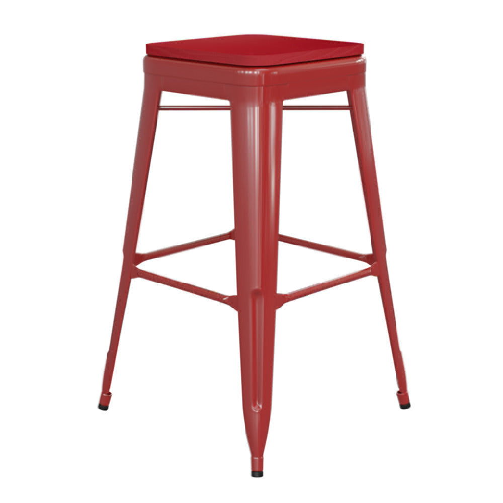The Flash Furniture CH-31320-30-RED-PL2R-GG Kai Bar Stool is an impressive seating solution, boasting a substantial 500 lb. weight capacity that caters to a variety of users. This backless stool features a striking red poly resin wood seat, which adds a vibrant touch to any setting. The stool's structural integrity is enhanced by a cross brace under the seat and galvanized steel construction, ensuring durability and stability. Designed with practicality in mind, it includes a footrest for added comfort and plastic floor glides to protect flooring surfaces. A powder coat finish provides an extra layer of protection against wear and tear. This lightweight stool can be conveniently stacked up to 4 stools high, making it an excellent choice for environments requiring flexible seating arrangements, such as bars, cafés, and event spaces. The Kai Bar Stool requires assembly but offers the advantage of shipping within 24 hours for in-stock items, allowing for quick and efficient setup. Its combination of style, strength, and functionality makes it a versatile option for various market segments, particularly those that prioritize both aesthetics and robust performance in high-traffic areas.