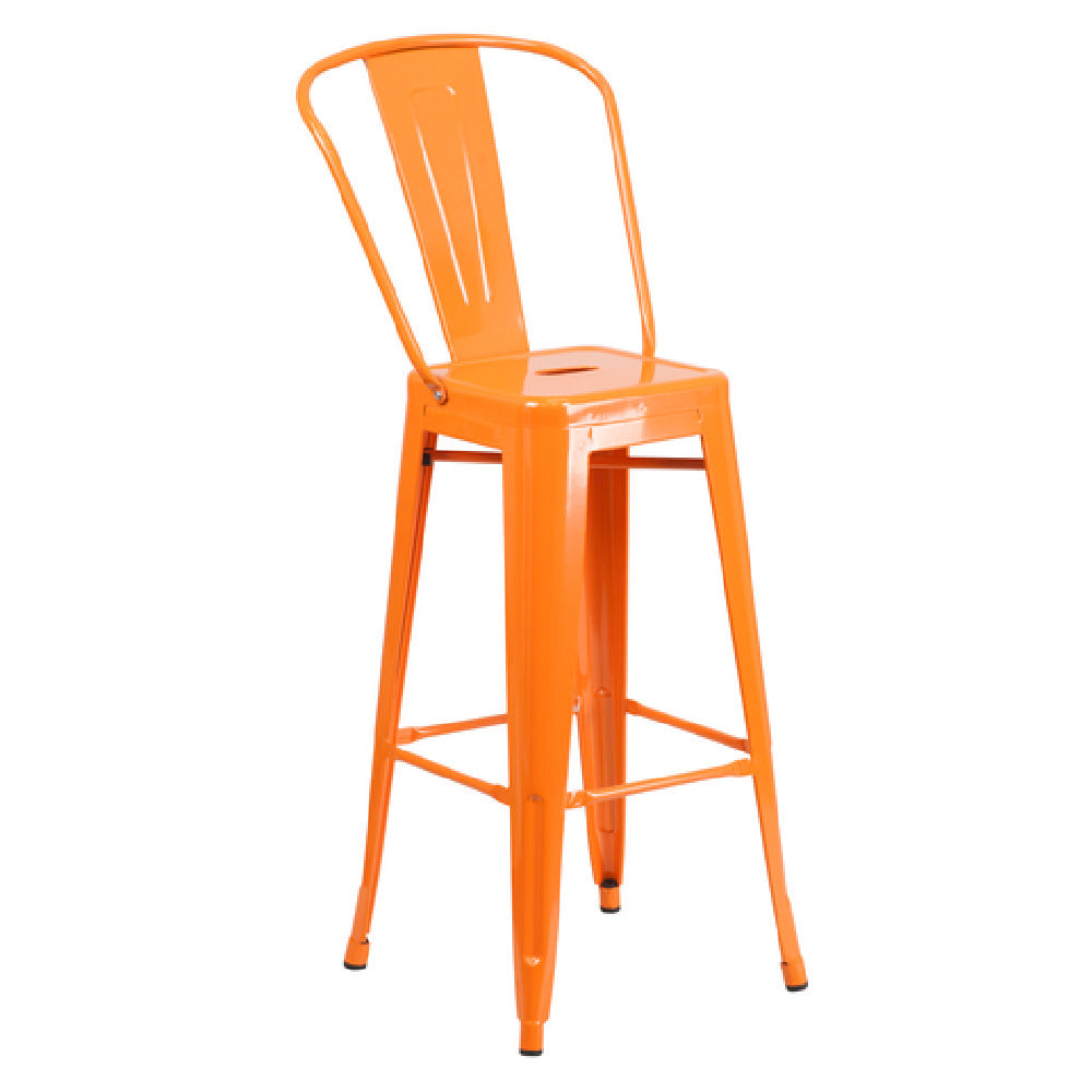 The Flash Furniture CH-31320-30GB-OR-GG Bar Stool - 500 lb. Weight Capacity Curved Back With Vertical Slat stands out in both commercial and residential settings, catering to diverse market segments with its robust features. This stool boasts a substantial weight capacity of 500 pounds, ensuring durability and reliability for users of varying sizes. Its curved back with a vertical slat design offers ergonomic support and aesthetic appeal, making it suitable for both modern and traditional decor. The stool features a drain hole in the seat, enhancing its practicality for outdoor use by allowing water to easily escape. Underneath, a cross brace provides additional support, reinforcing the stool's sturdy galvanized steel construction. The powder coat finish in vibrant orange not only adds a splash of color but also protects against weathering, making it ideal for indoor and outdoor use. Equipped with a footrest and plastic floor glides, this bar stool ensures comfort and floor protection. Lightweight and designed for versatility, it is a reliable choice for any setting that requires durable seating. Assembly is required, and in-stock items typically ship within 24 hours, ensuring quick delivery for immediate needs.