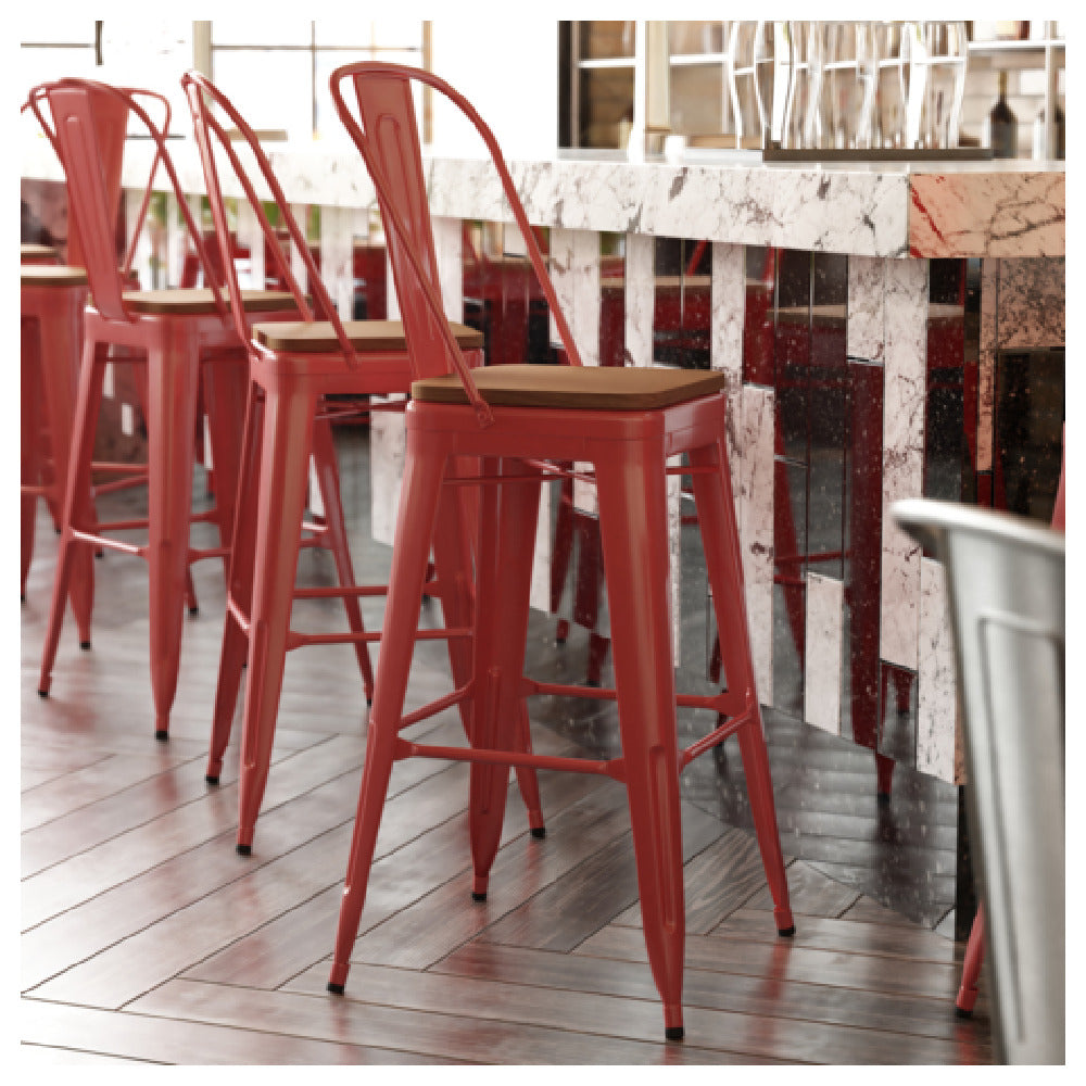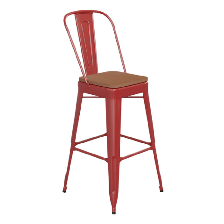 The Flash Furniture CH-31320-30GB-RED-PL2T-GG Kai Bar Stool is a versatile seating solution, boasting a substantial weight capacity of 500 lbs, which supports a broad spectrum of users in various settings. This bar stool features a distinctive curved back with a vertical slat design, providing both comfort and aesthetic appeal. It is equipped with a teak poly resin seat, enhancing durability and resistance to environmental factors. The stool's structural integrity is reinforced by a cross brace under the seat, constructed from galvanized steel with a powder coat finish, ensuring longevity and protection against corrosion. Designed for adaptability, it is suitable for both indoor and outdoor use, making it a practical choice for diverse environments such as restaurants, patios, and home bars. The inclusion of a footrest adds to its ergonomic design, while plastic floor glides offer protection for flooring surfaces. Available in a vibrant red color, this bar stool requires assembly, allowing for straightforward set-up. Its combination of robust materials and thoughtful design makes it a valuable addition to any setting where reliable and stylish seating is desired.