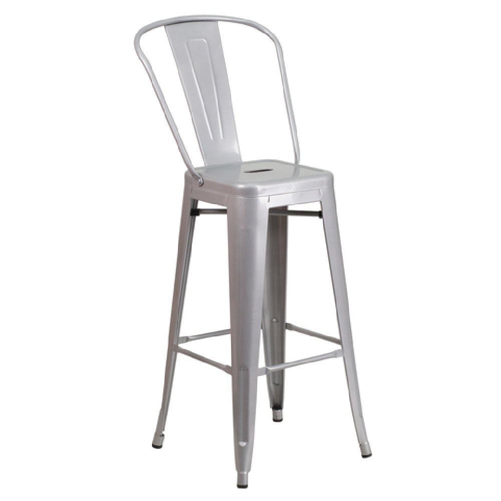 The Flash Furniture CH-31320-30GB-SIL-GG Bar Stool is a versatile seating solution engineered for both indoor and outdoor use, offering a substantial 500 lb. weight capacity. This bar stool features a distinctive curved back with a vertical slat design, providing ergonomic support and a stylish aesthetic. Crafted from galvanized steel, it boasts a durable powder coat finish in a sleek silver hue, ensuring long-lasting resilience against the elements. The seat is designed with a drain hole, promoting water drainage for outdoor settings. Additionally, the stool is equipped with a cross brace under the seat to enhance stability and durability. For added comfort, it includes a footrest, and the plastic floor glides protect surfaces from scratches and scuffs. Lightweight in construction, this bar stool is easily maneuverable, making it a practical choice for both commercial and residential environments. Assembly is required, but once completed, it serves as a robust seating option suitable for a wide range of applications. With its prompt shipping of in-stock items within 24 hours, the Flash Furniture CH-31320-30GB-SIL-GG Bar Stool is an excellent choice for those seeking a reliable, stylish, and functional seating option.