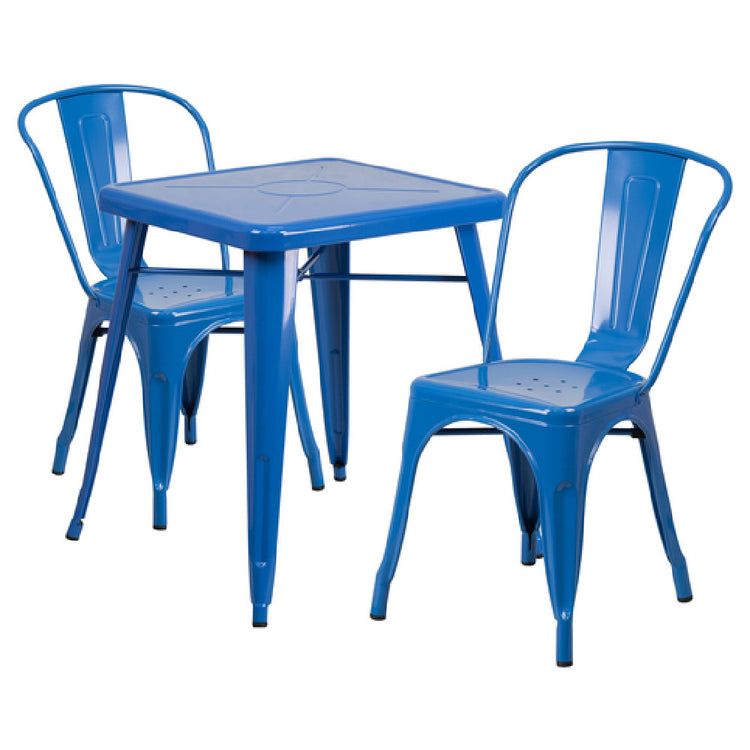 The Flash Furniture CH-31330-2-30-BL-GG Table and Chair Set is a functional and stylish furniture solution designed for both commercial and residential use. This set includes a square table measuring 23-3/4"W x 23-3/4"D x 29"H with a footprint of 27-3/4"W x 27-3/4"D, accentuated by a 2" thick edge and a cross brace for enhanced stability. Accompanying the table are two chairs, each measuring 18"W x 20"D x 33"H, featuring a curved back with vertical slats and strategically placed drain holes in the seat for easy maintenance. Constructed from galvanized steel with a durable powder coat finish, this set is suitable for both indoor and outdoor environments. The cross brace under each seat ensures added support, while the rubber floor glides protect flooring surfaces. With its vibrant blue color, this set stands out in any setting. Assembly is required, and the product is shipped in two boxes, with in-stock items typically shipping within 24 hours. The Flash Furniture CH-31330-2-30-BL-GG Table and Chair Set is a versatile choice for cafes, patios, and home dining areas, offering practical design and robust construction for varied applications.