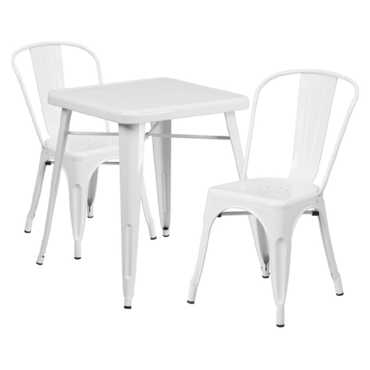The Flash Furniture CH-31330-2-30-WH-GG Table And Chair Set is an expertly designed furniture piece that combines functionality and style, perfect for both commercial and residential spaces. This set includes a square table measuring 23-3/4"W x 23-3/4"D x 29"H with a footprint of 27-3/4"W x 27-3/4"D, featuring a 2" thick edge and a sturdy cross brace for added stability. Accompanying the table are two chairs, each measuring 18"W x 20"D x 33"H, with a curved back and vertical slat design that ensures comfort and elegant aesthetics. The chair seats are equipped with drain holes, making them ideal for outdoor use, while the cross brace under the seat offers additional support. Constructed from galvanized steel and finished with a durable powder coat, this set is designed to withstand the demands of indoor and outdoor environments. The inclusion of rubber floor glides ensures that your floors remain unscathed whether in use on a patio or a dining room. Shipped in two boxes for ease, this set is typically dispatched within 24 hours and requires assembly upon arrival, offering a quick and stylish solution for any setting.