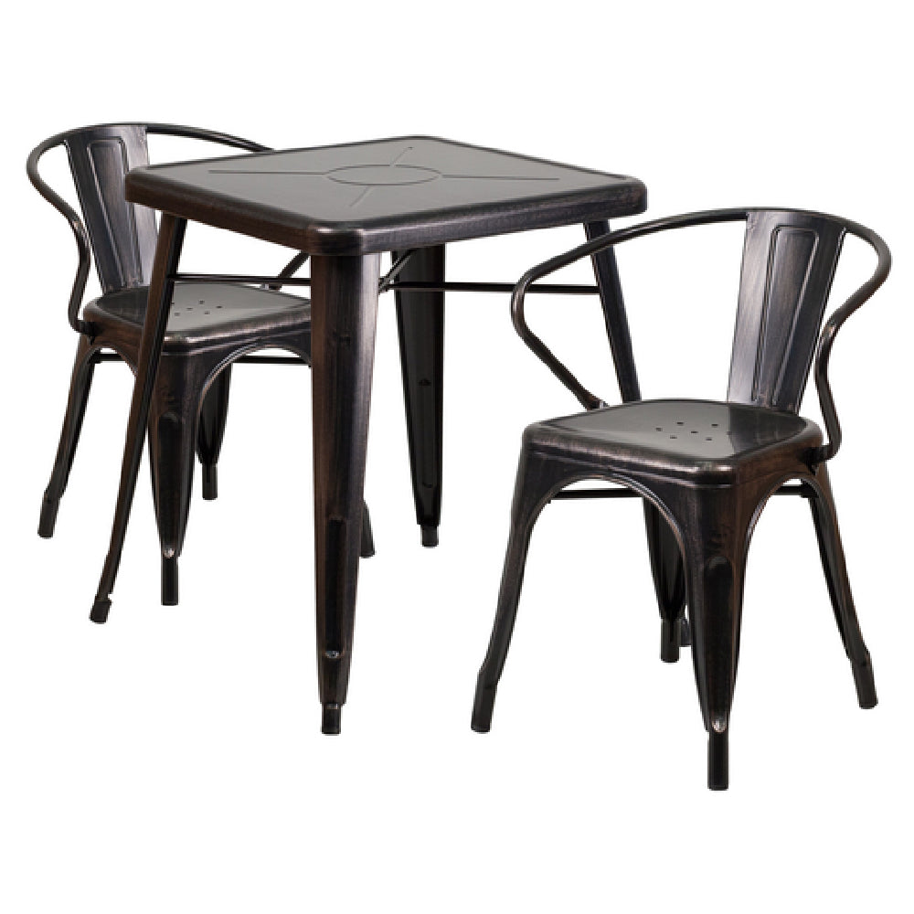The Flash Furniture CH-31330-2-70-BQ-GG Table And Chair Set is a versatile solution for both commercial and residential spaces, offering a balanced combination of style and functionality. This set includes a square table with dimensions of 23-3/4"W x 23-3/4"D x 29"H and a footprint of 27-3/4"W x 27-3/4"D, providing ample space for various activities. The table features a 2" thick edge and a cross brace for enhanced stability. Accompanying the table are two arm chairs, each measuring 21-1/2"W x 19"D x 27-3/4"H, featuring a curved back with a vertical slat design and integrated arms for added comfort. The chairs have drain holes in the seat and a cross brace under the seat, ensuring durability and ease of maintenance. Constructed from galvanized steel with a powder coat finish, this set is designed to withstand indoor and outdoor use. The black and antique gold color scheme adds a touch of elegance, while rubber floor glides protect flooring surfaces. Assembly is required, and the set is shipped in two boxes. Ideal for diverse markets, this table and chair set is a practical choice for anyone seeking a reliable and stylish seating solution.