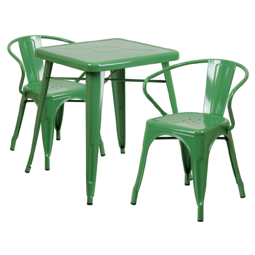 The Flash Furniture CH-31330-2-70-GN-GG Table and Chair Set is a versatile solution for both indoor and outdoor settings, catering to commercial and residential needs. This set includes a square table with dimensions of 23-3/4"W x 23-3/4"D x 29"H, featuring a sturdy 2" thick edge and a cross-brace for enhanced stability. The table's footprint measures 27-3/4"W x 27-3/4"D, providing a compact yet functional space for various uses. Accompanying the table are two armchairs, each with a size of 21-1/2"W x 19"D x 27-3/4"H, designed for comfort with a curved back and vertical slat, integrated arms, and handy drain holes in the seat for efficient water shedding. The materials used in the construction are galvanized steel with a durable powder coat finish, ensuring longevity and resistance to weather elements. Rubber floor glides protect indoor surfaces and ensure easy movement. With its thoughtful design and robust construction, this set is perfectly suited for versatile environments, shipped in two boxes, and typically ready for dispatch within 24 hours, making it a reliable choice for diverse market segments. Assembly is required, adding a personal touch to the setup process.