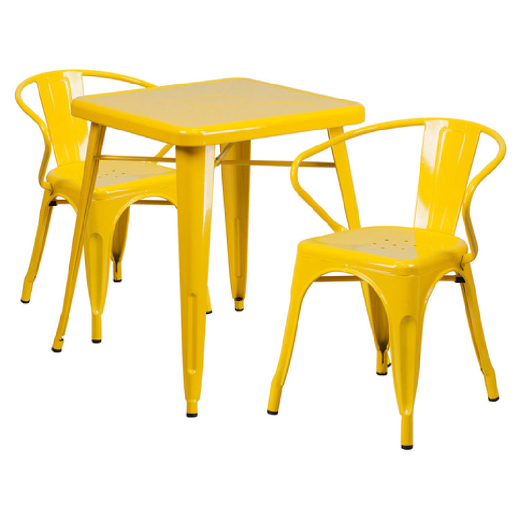 The Flash Furniture CH-31330-2-70-YL-GG Table And Chair Set is a well-designed furniture ensemble that includes a square table and two armchairs, crafted to meet the demands of both commercial and residential settings. The table measures 23-3/4 inches in width and depth, with a height of 29 inches, featuring a sturdy 2-inch thick edge and a cross brace for additional support. Its footprint expands to 27-3/4 inches in both width and depth, ensuring stability. The set's armchairs are 21-1/2 inches wide, 19 inches deep, and 27-3/4 inches high, equipped with a curved back and vertical slat design. The integrated arms and drain holes in the seat enhance functionality and comfort, while the cross brace under the seat provides extra strength. Constructed from galvanized steel with a powder coat finish, this set is designed for both indoor and outdoor use. Rubber floor glides protect surfaces and ease movement. Available in a vibrant yellow color, the Flash Furniture set ships in two boxes, with assembly required. Items in stock typically ship within 24 hours, making it a practical and stylish choice for a variety of environments.