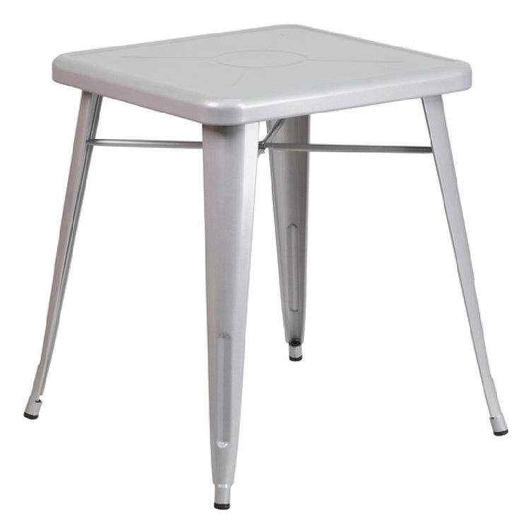 The Flash Furniture CH-31330-29-SIL-GG Table is a versatile and durable piece designed to meet the needs of both commercial and residential environments. With dimensions of 23-3/4"W x 23-3/4"D x 29"H, this square dining-height table provides an ideal balance of size and functionality, making it suitable for a variety of settings. Its footprint measures 27-3/4"W x 27-3/4"D, allowing for stable placement in any space. Constructed from galvanized steel with a powder coat finish, this table is built for durability and longevity, featuring a robust 2" thick edge. The inclusion of a cross brace enhances its structural integrity, while rubber floor glides protect surfaces and prevent slipping. Designed for indoor and outdoor use, the table adapts to different environments, offering reliable performance in both commercial and residential settings. The sleek silver color adds a modern aesthetic, complementing various decor styles. While assembly is required, its straightforward design ensures a quick setup, and in-stock items typically ship within 24 hours, ensuring prompt availability. The Flash Furniture CH-31330-29-SIL-GG Table is an excellent choice for those seeking a stylish and enduring table for diverse applications.