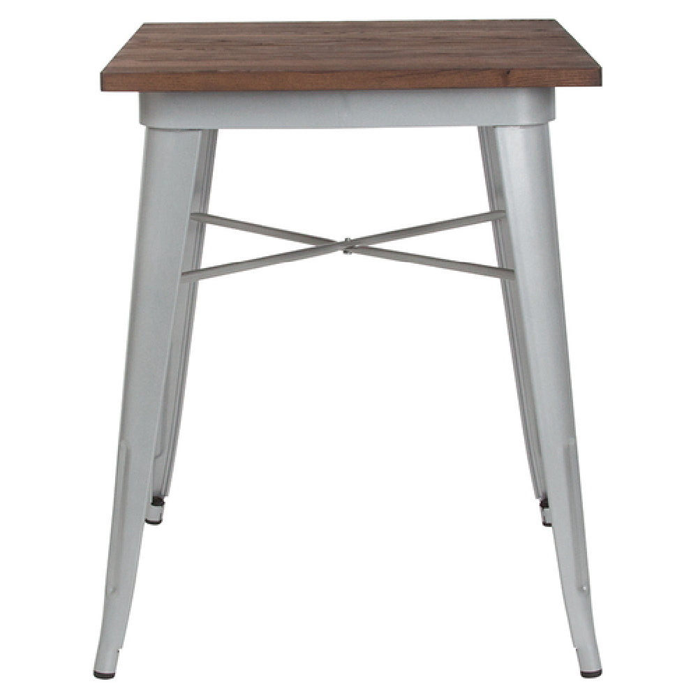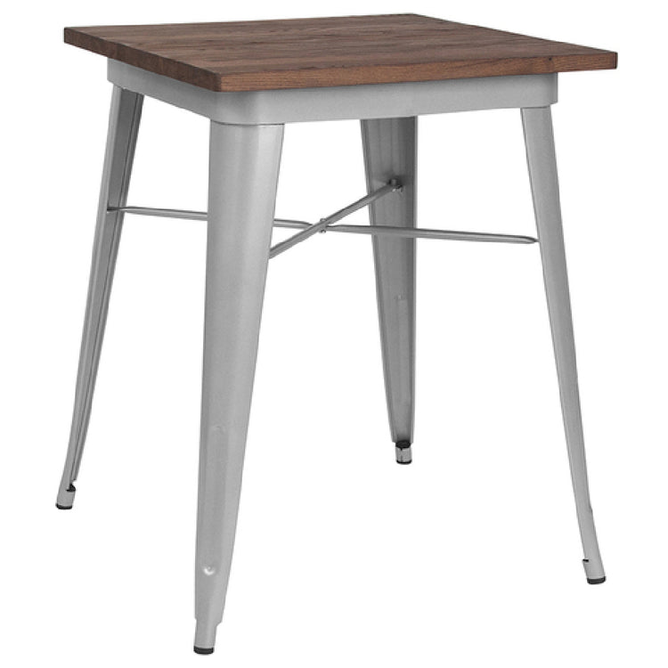 The Flash Furniture CH-31330-29M1-SIL-GG Table is a versatile dining-height solution measuring 23-1/2"W x 23-1/2"D x 30-1/4"H with a footprint of 26"W x 26"D. Featuring a square, textured walnut elm wood top with a substantial 1" thick edge, this table combines aesthetics with functionality. The galvanized steel frame provides robust support and durability, while the cross brace enhances stability, making it a reliable choice for both commercial and residential settings. The table's silver powder coat finish not only adds a modern touch but also offers protection against wear and tear, ensuring longevity. Rubber floor glides are included to prevent scratches and marks on flooring surfaces, making it suitable for various environments. This product requires assembly and is typically shipped within 24 hours for in-stock items, making it a convenient and efficient choice for businesses and consumers alike. The Flash Furniture CH-31330-29M1-SIL-GG Table's combination of high-quality materials and thoughtful design makes it a valuable addition to any dining area, appealing to markets that prioritize both style and functionality in their furniture selections.