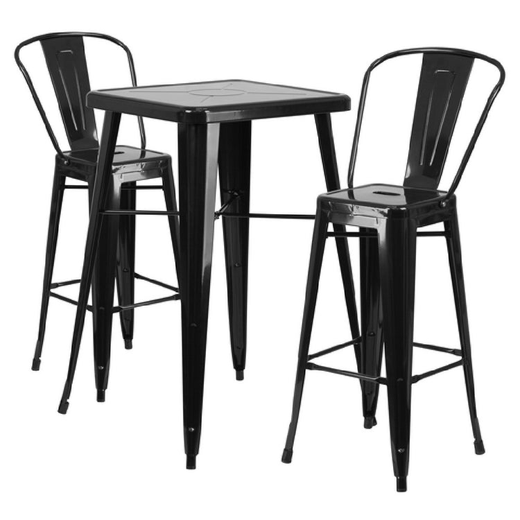 Flash Furniture CH-31330B-2-30GB-BK-GG Table and Bar Stool Set is a versatile furniture ensemble ideal for both commercial and residential settings. This set includes a square bar-height table measuring 27-3/4 inches in width and depth, and 40 inches in height, with a sturdy 2-inch thick edge and a cross brace for added stability. Accompanying the table are two bar stools, each designed with a curved back featuring a vertical slat and a cross brace under the seat for enhanced support. The stools also include a drain hole in the seat for convenience and a footrest for comfort. Made from galvanized steel and coated with a durable powder finish, this set is designed to withstand various environments, making it suitable for indoor and outdoor use. The black finish gives it a sleek and modern look, while the rubber floor glides protect surfaces. Assembly is required, and the set is shipped in two boxes. In-stock items are typically dispatched within 24 hours, ensuring a prompt delivery. This furniture set is perfect for creating a stylish and functional seating area in cafes, patios, or home bars, combining durability with contemporary design.