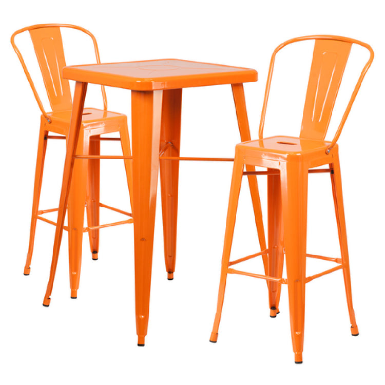 Flash Furniture CH-31330B-2-30GB-OR-GG Table And Bar Stool Set is a meticulously designed furniture ensemble tailored for both commercial and residential use, offering a blend of style and functionality. The set includes a square table measuring 27-3/4 inches in width and depth, standing at a bar height of 40 inches, with a sturdy 2-inch thick edge and cross brace for enhanced stability. Complementing the table are two bar stools, featuring a curved back with a vertical slat for ergonomic support, and a drain hole in the seat to prevent water accumulation, making them ideal for outdoor settings. Each stool is reinforced with a cross brace under the seat and a footrest for comfort. Constructed from galvanized steel with a vibrant orange powder coat finish, this set is designed to withstand diverse environments, from bustling bars to serene home patios. Rubber floor glides are included to protect surfaces from scratches. The set requires assembly and is conveniently shipped in two boxes, with in-stock items typically dispatched within 24 hours. This versatile furniture set is a dynamic solution for those seeking durability combined with contemporary aesthetics for indoor or outdoor spaces.