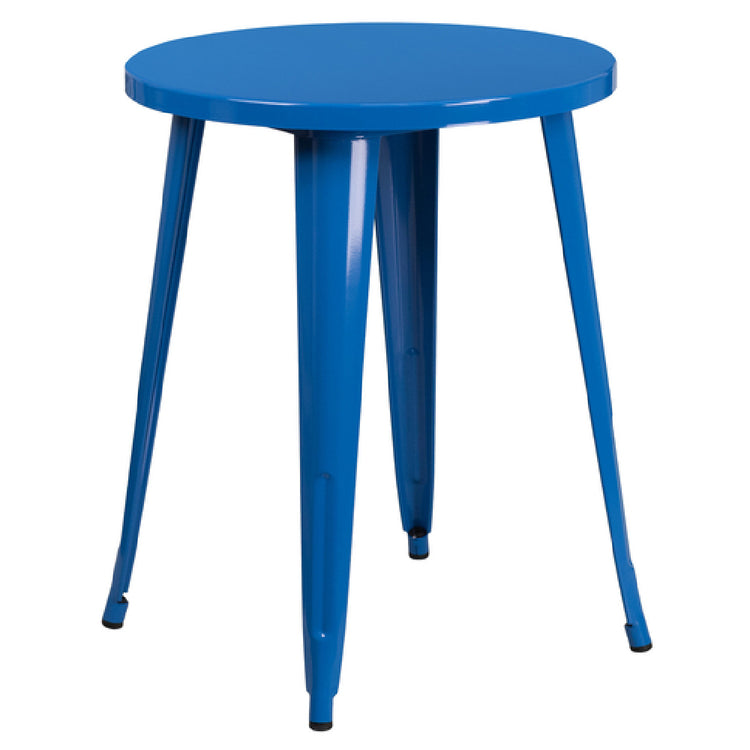 Flash Furniture CH-51080-29-BL-GG Table 24" Dia. X 29"H Dining Height is a versatile table designed for both indoor and outdoor use, catering to commercial and residential environments. This table features a round, smooth top with a diameter of 24 inches and a height of 29 inches, providing a comfortable dining height. The edge of the table is 1-1/4 inches thick, ensuring durability and stability. A brace is incorporated underneath the top to enhance strength, making it suitable for various settings, from cafes to home patios. Constructed from metal with a protective powder coat finish, this table is designed to withstand the rigors of frequent use while maintaining its aesthetic appeal. The blue color adds a vibrant touch to any setting, and the table includes rubber floor glides to prevent damage to flooring surfaces. Assembly is required upon delivery. With items typically shipping within 24 hours when in stock, this table is a convenient and reliable choice for those seeking a durable and stylish addition to their dining spaces.