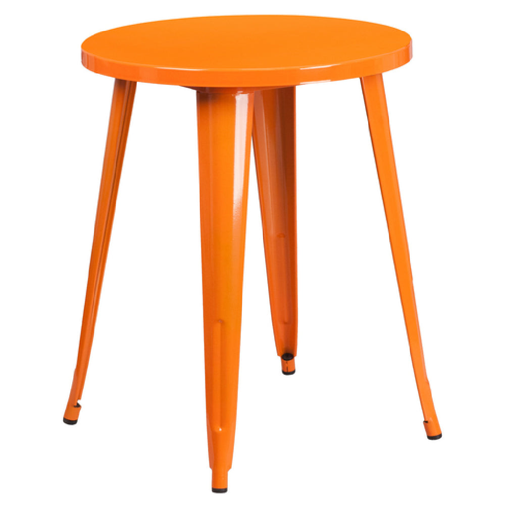 Flash Furniture CH-51080-29-OR-GG Table 24" Dia. X 29"H Dining Height is a versatile and practical piece of furniture designed for both commercial and residential settings. This round table features a smooth top with a 24-inch diameter and a sturdy 1-1/4-inch thick edge, ensuring durability and stability for everyday use. The dining height of 29 inches makes it an ideal choice for a variety of dining environments. It incorporates a brace underneath the top, providing additional support and rigidity. Crafted from metal with a powder coat finish, this table is designed to withstand indoor and outdoor conditions, making it suitable for cafes, patios, and dining rooms alike. The vibrant orange color adds a pop of color to any space. Equipped with rubber floor glides, it is gentle on floors and easy to move. Assembly is required, but the table's straightforward design ensures that it can be set up with minimal effort. Typically, in-stock items can be shipped within 24 hours, offering quick convenience for immediate needs. This table's blend of style, durability, and functionality makes it a valuable addition to any dining area.