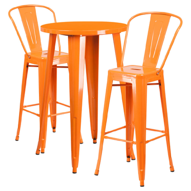 The Flash Furniture CH-51080BH-2-30CAFE-OR-GG Table and Bar Stool Set includes a bar height table and two bar stools, combining functionality and style for versatile use in commercial and residential settings. The centerpiece is a round table measuring 24 inches in diameter and 41 inches in height, featuring a smooth top with a 1-1/4 inch thick edge and a supportive brace underneath, ensuring durability and stability. Accompanying the table are two bar stools, each with dimensions of 17-3/4 inches in width, 20 inches in depth, and 45-1/4 inches in height. The stools are designed with a curved back and vertical slat for ergonomic support and comfort. Built from metal with a powder coat finish, both the table and stools are resilient and suitable for indoor and outdoor use. The stools incorporate drain holes in the seat and a cross brace under the seat for added strength, along with a footrest for convenience. Rubber floor glides protect flooring surfaces. This set is shipped in two boxes and typically dispatches within 24 hours when in stock, offering a practical and stylish solution for cafes, bars, and home entertainment areas.