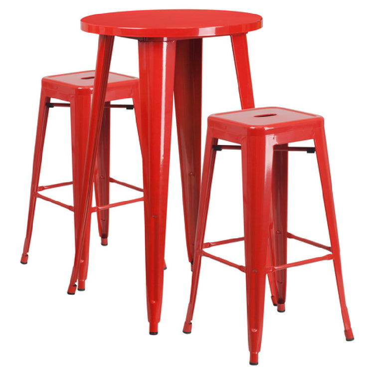Flash Furniture CH-51080BH-2-30SQST-RED-GG Table And Bar Stool Set includes a meticulously designed 24" diameter by 41" high table and two bar stools, making it an excellent choice for both commercial and residential settings. The table features a round, smooth top with a 1-1/4" thick edge and a brace underneath, ensuring stability and durability. This bar-height table is complemented by two backless bar stools that boast a square seat complete with a convenient drain hole and cross brace beneath for added strength. Each stool is equipped with a footrest, enhancing comfort during extended use. Constructed from sturdy metal with a vibrant red powder coat finish, the set is designed for versatile indoor and outdoor use. Rubber floor glides are included to safeguard flooring surfaces and maintain stability. While assembly is required, the ease of setup is facilitated by a streamlined shipping process, with in-stock items typically dispatched within 24 hours. This table and bar stool set is a practical and stylish solution for hospitality venues or home bar areas, offering a balance of aesthetic appeal and functional design.