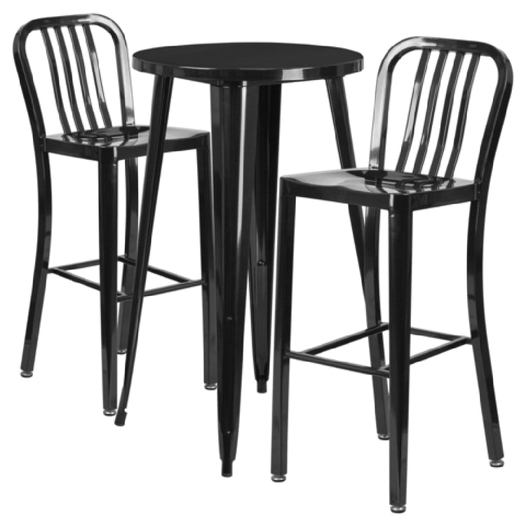 The Flash Furniture CH-51080BH-2-30VRT-BK-GG Table and Bar Stool Set includes a 24-inch diameter by 41-inch high table, making it an excellent choice for both commercial and residential settings. This set is designed with a bar height, round, smooth top table that features a 1-1/4-inch thick edge and a brace underneath for added stability. Complementing the table, the set includes two bar stools, each measuring 15-1/2 inches wide, 20 inches deep, and 43 inches high, with a vertical slat back and footrest for comfortable seating. Constructed from metal with a powder coat finish, the set is durable and suitable for indoor and outdoor use. The table is equipped with rubber floor glides, while the chairs have adjustable floor glides, ensuring ease of movement and floor protection. Available in black, this set ships in two boxes and usually dispatches within 24 hours for in-stock items. The Flash Furniture CH-51080BH-2-30VRT-BK-GG set provides a versatile and stylish solution for various environments, offering functionality and aesthetic appeal for restaurants, cafes, home dining areas, and more, where both durability and design are paramount.