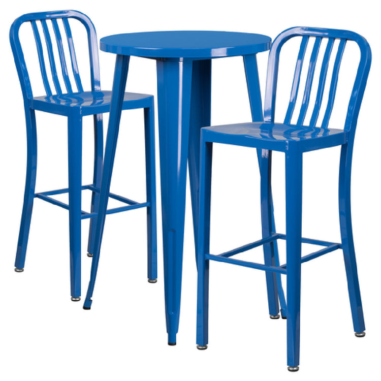 The Flash Furniture CH-51080BH-2-30VRT-BL-GG Table and Bar Stool Set is an ideal choice for both commercial and residential settings, designed for versatility in indoor and outdoor environments. This set includes a round table measuring 24 inches in diameter and standing 41 inches high, featuring a smooth top with a 1-1/4-inch thick edge and a brace underneath for added stability. Accompanying the table are two bar stools, each with dimensions of 15-1/2 inches wide by 20 inches deep by 43 inches high, equipped with a vertical slat back and a footrest for enhanced comfort. The set is constructed from metal and finished with a durable powder coat, ensuring longevity and resistance to wear. The table includes rubber floor glides, while the chairs are fitted with adjustable floor glides to provide stability on uneven surfaces. Available in blue, this set requires assembly and is shipped in two boxes. In-stock items are typically dispatched within 24 hours, ensuring quick delivery. This product's blend of robust construction and practical design makes it a valuable addition to any space requiring functional yet stylish seating solutions.