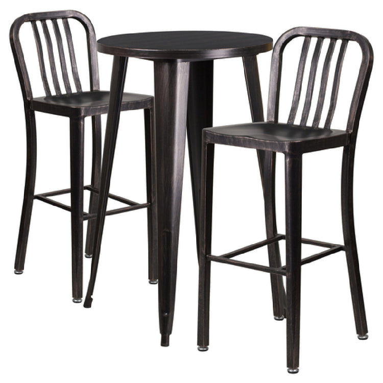 Flash Furniture CH-51080BH-2-30VRT-BQ-GG Table and Bar Stool Set includes a 24-inch diameter by 41-inch high table designed to meet the diverse needs of both commercial and residential spaces. This bar-height table features a round, smooth top with a 1-1/4 inch thick edge and an underside brace, ensuring stability and durability. Accompanying the table are two bar stools measuring 15-1/2 inches wide by 20 inches deep by 43 inches high, each with a vertical slat back and a convenient footrest. Made from metal with a stylish powder coat finish, these stools are built for long-lasting use. Rubber floor glides on the table and adjustable floor glides on the chairs provide versatility across various surfaces, making this set suitable for both indoor and outdoor environments. The set is presented in a sophisticated black and antique gold color scheme, adding an elegant touch to any setting. Assembly is required, and the product ships in two boxes. For the hospitality industry, event planners, or homeowners looking to enhance their dining spaces, this set delivers both functionality and aesthetic appeal, typically shipping within 24 hours for in-stock items.