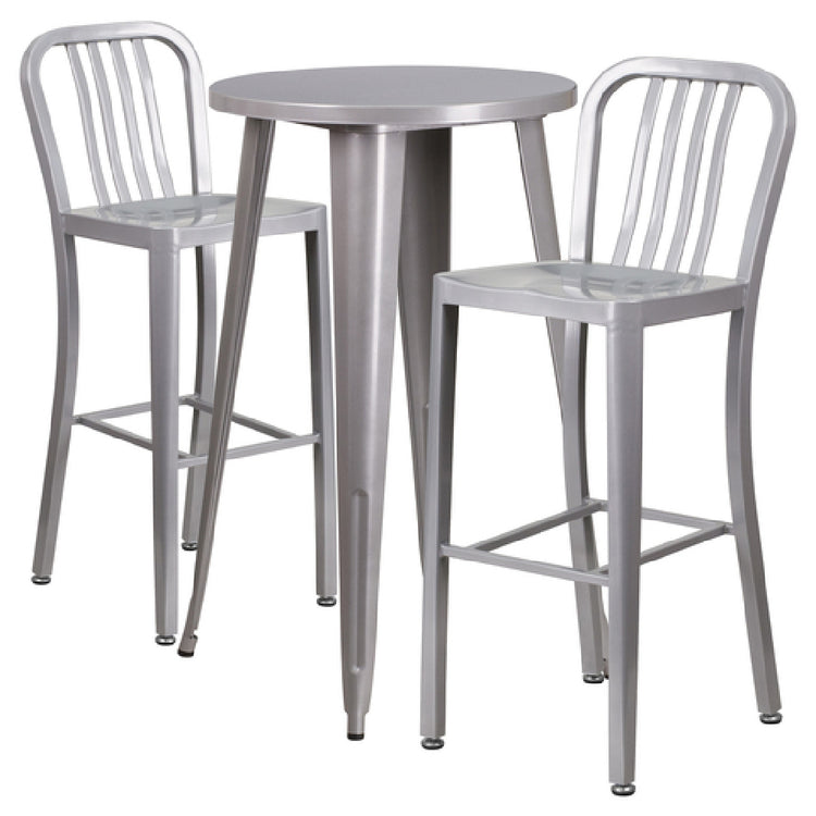 Flash Furniture CH-51080BH-2-30VRT-SIL-GG Table And Bar Stool Set is a versatile furniture set perfect for both indoor and outdoor commercial and residential settings. The set includes a sturdy 24" diameter x 41" height bar-height table with a round, smooth top and a substantial 1-1/4" thick edge. Designed for durability, the table features a brace underneath the top, ensuring stability and strength. Complementing the table are two bar stools, each measuring 15-1/2" width x 20" depth x 43" height, with vertical slat backs and integrated footrests for added comfort. Constructed from metal with a powder coat finish, the set is built to withstand various environments while maintaining a sleek appearance. The table is equipped with rubber floor glides, while the chairs have adjustable floor glides, allowing for stability on uneven surfaces. This furniture set is shipped in two boxes, ensuring ease of transport, and is designed for assembly upon arrival. The Flash Furniture CH-51080BH-2-30VRT-SIL-GG set typically ships within 24 hours when in stock, making it a convenient and practical choice for those seeking reliable and stylish seating solutions for diverse settings.