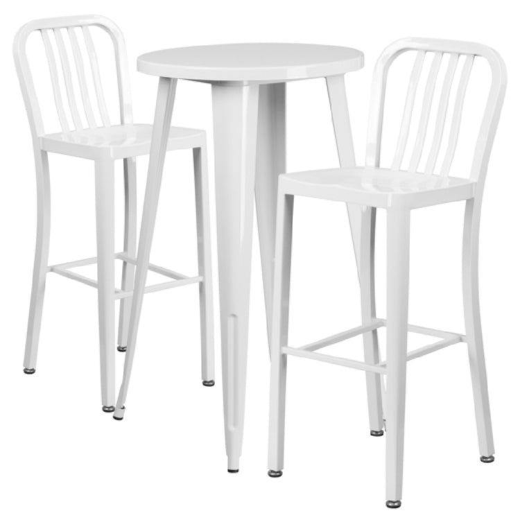 The Flash Furniture CH-51080BH-2-30VRT-WH-GG Table and Bar Stool Set stands out with its combination of functionality and style, tailored for various market segments including commercial and residential environments. This set includes a bar-height, round table measuring 24 inches in diameter and standing 41 inches tall, featuring a smooth top with a 1-1/4 inch thick edge and a supportive brace underneath for added stability. Accompanying the table are two bar stools, each with dimensions of 15-1/2 inches in width, 20 inches in depth, and 43 inches in height, offering a comfortable seating experience with a vertical slat back and footrest. The set is crafted from durable metal with a powder coat finish, ensuring its suitability for both indoor and outdoor use. Practical features like rubber floor glides on the table and adjustable floor glides on the chairs enhance stability and protect flooring surfaces. Available in a white finish, this set requires assembly and is shipped in two boxes, with in-stock items typically dispatched within 24 hours. This well-designed set provides a versatile and stylish seating solution, meeting the demands of high-traffic commercial settings while also enhancing residential dining spaces.