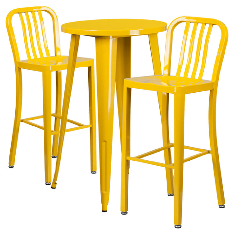 Flash Furniture CH-51080BH-2-30VRT-YL-GG Table and Bar Stool Set is a versatile furniture solution designed for both indoor and outdoor use in commercial and residential settings. This set includes a 24-inch diameter round table with a height of 41 inches, featuring a smooth top with a 1-1/4 inch thick edge and a supporting brace underneath for added stability. The set also comprises two bar stools, each measuring 15-1/2 inches in width, 20 inches in depth, and 43 inches in height, equipped with vertical slat backs and a convenient footrest. Constructed from durable metal with a powder coat finish, this set is built to withstand various environments. The table is fitted with rubber floor glides, and the stools have adjustable floor glides for stability on uneven surfaces. Its bright yellow color adds a vibrant touch to any space. The set requires assembly and is shipped in two boxes, with in-stock items typically dispatched within 24 hours. This furniture set offers a practical and stylish seating solution for a range of settings, combining durability with aesthetic appeal.