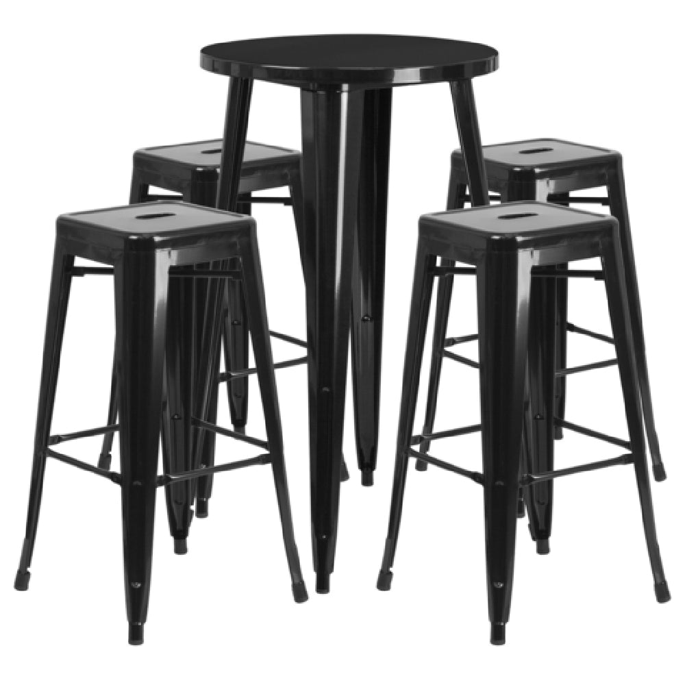 The Flash Furniture CH-51080BH-4-30SQST-BK-GG Table And Bar Stool Set is a versatile furniture ensemble designed for both commercial and residential environments. This set includes a round table with a diameter of 24 inches and a height of 41 inches, making it suitable for bar-height settings. The table features a smooth top with a 1-1/4 inch thick edge and a supportive brace underneath, ensuring stability and durability. Accompanying the table are four backless bar stools with square seats, each equipped with a drain hole and a cross brace under the seat, enhancing structural integrity and practicality. The inclusion of footrests provides added comfort, while the set's metal construction with a powder coat finish offers durability and a sleek black appearance. Designed for indoor and outdoor use, this set is equipped with rubber floor glides to protect surfaces from scratches. The Flash Furniture Table And Bar Stool Set is shipped in two boxes, with assembly required, and is typically available for shipping within 24 hours of ordering. This product is particularly valuable for hospitality settings, cafes, or home dining areas that require a durable and stylish seating solution.