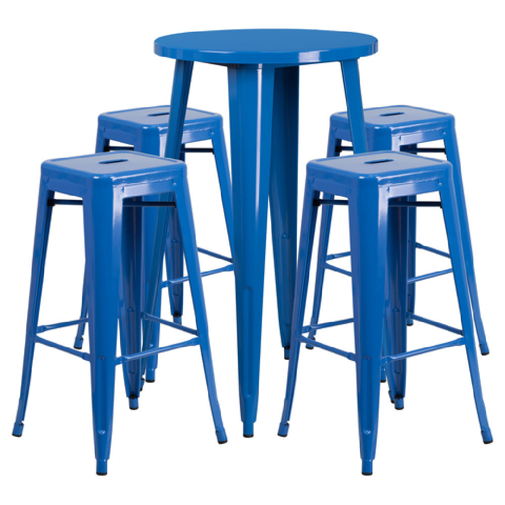 The Flash Furniture CH-51080BH-4-30SQST-BL-GG Table And Bar Stool Set is a versatile furniture solution designed for both commercial and residential use. This set features a bar-height table measuring 24 inches in diameter and 41 inches in height, with a smooth top and a 1-1/4 inch thick edge, supported by a brace underneath for added stability. Accompanying the table are four backless bar stools with a square seat design, each incorporating a drain hole and a cross brace under the seat for enhanced support. The stools also include a convenient footrest for comfort. Constructed from metal with a durable powder coat finish, this set is suited for indoor and outdoor environments. The rubber floor glides provide protection for flooring surfaces. While the set requires assembly, it is shipped in two boxes and is typically available for shipping within 24 hours. The blue color offers a vibrant option for various décor styles, making this set a practical and stylish choice for dining spaces, home bars, or commercial settings such as cafes and bistros. Its durability and functionality meet the demands of diverse market segments, ensuring both aesthetic appeal and reliable performance.