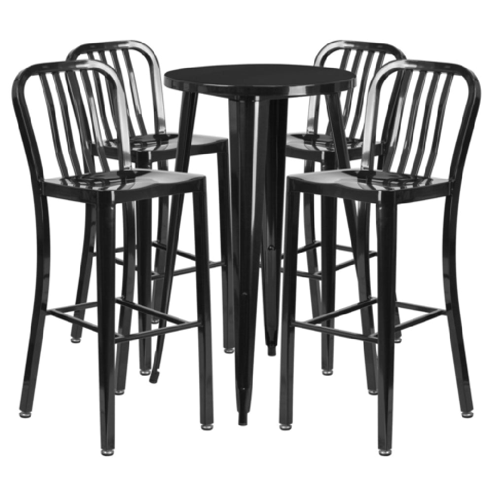 The Flash Furniture CH-51080BH-4-30VRT-BK-GG Table And Bar Stool Set includes a meticulously designed 24" diameter x 41" height table, complemented by a set of four bar stools, each measuring 15-1/2" width x 20" depth x 43" height. This set is a testament to versatility and durability, featuring a round, smooth table top with a 1-1/4" thick edge and a brace underneath for enhanced stability. Constructed with metal and finished with a powder coat, both the table and stools are engineered for longevity. The set boasts a vertical slat back on the stools and a footrest for added comfort. Designed for both indoor and outdoor use, this furniture set is ideal for commercial and residential settings, adapting seamlessly to different environments. The table is equipped with rubber floor glides, while the chairs have adjustable floor glides, ensuring protection and adaptability on various surfaces. Available in a sleek black finish, this set requires assembly and is conveniently shipped in two boxes, with in-stock items typically shipping within 24 hours. This combination of features delivers a robust and practical seating solution for any space.