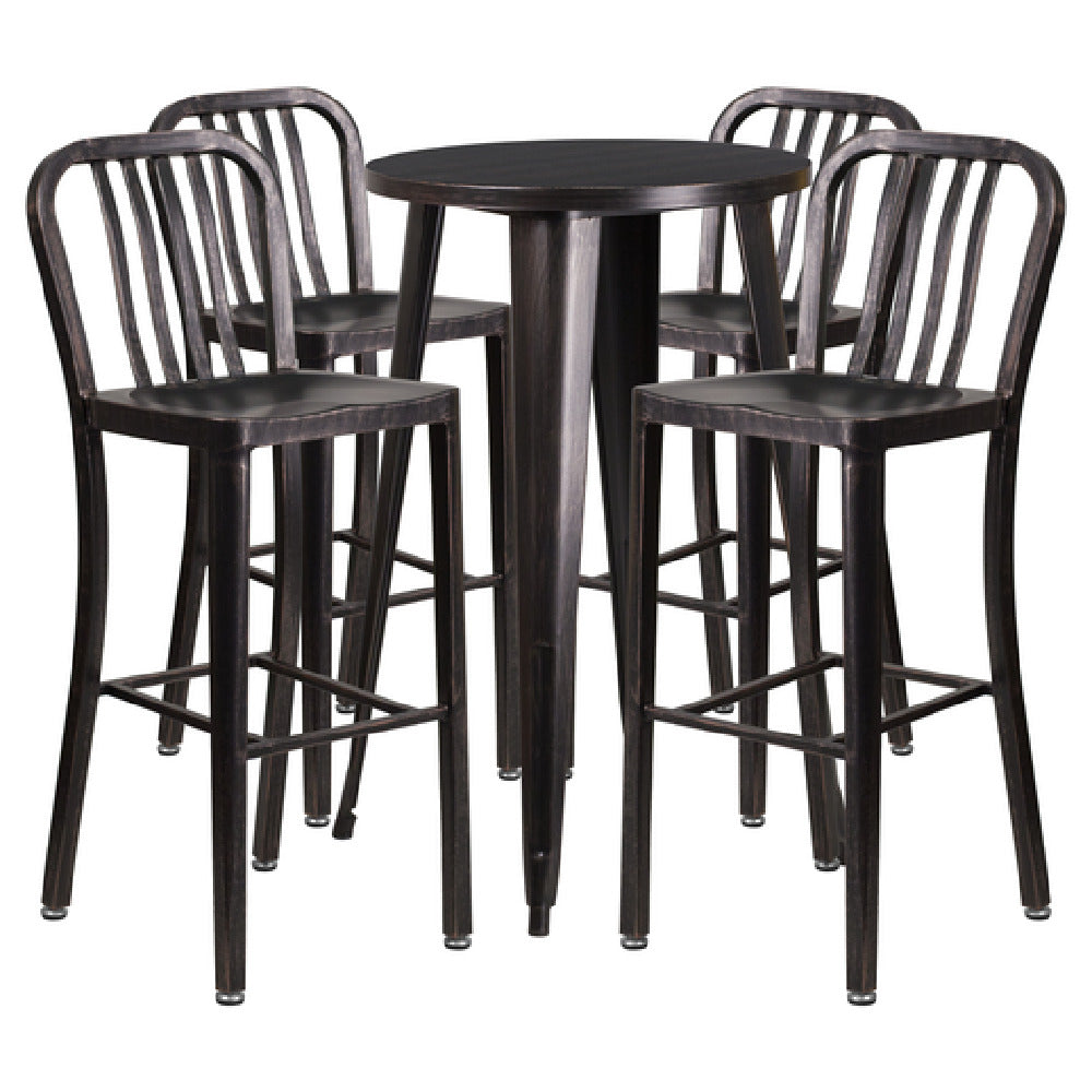 The Flash Furniture CH-51080BH-4-30VRT-BQ-GG Table and Bar Stool Set includes a stylish and robust 24-inch diameter by 41-inch high table, making it a perfect fit for both commercial and residential environments. The bar-height table is complemented by a smooth, round top with a 1-1/4-inch thick edge and has an underneath brace for enhanced support. Accompanying the table are four bar stools, each measuring 15-1/2 inches wide by 20 inches deep by 43 inches high, featuring a vertical slat back design and a footrest for added comfort. Constructed from durable metal with a powder coat finish, this set is designed for indoor and outdoor use, offering flexibility for various settings. The table's rubber floor glides and the chairs' adjustable floor glides protect flooring surfaces, ensuring stability on uneven surfaces. Available in a sophisticated black and antique gold color scheme, this set not only brings functionality but also aesthetic appeal to dining spaces. The set requires assembly and is shipped in two separate boxes, with in-stock items typically shipping within 24 hours, providing a quick and practical solution for furnishing diverse environments.
