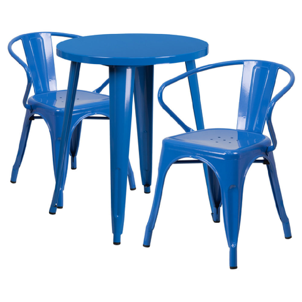 The Flash Furniture CH-51080TH-2-18ARM-BL-GG Table And Chair Set is an adaptable choice for both commercial and residential settings, designed to meet a variety of indoor and outdoor needs. This set features a round table with a 24-inch diameter and a 29-inch height, offering a smooth top and a robust 1-1/4-inch thick edge. The table's stability is enhanced with a brace underneath the top. Accompanying the table are two chairs, each measuring 21-1/2 inches in width, 19 inches in depth, and 27-3/4 inches in height. These chairs are designed with a curved back and vertical slat for comfort, integrated arms, and practical drain holes in the seat for outdoor use. A cross brace under the seat adds strength, while metal construction with a blue powder coat finish ensures durability. Rubber floor glides protect surfaces, making this set ideal for various environments. The set requires assembly and is shipped in two boxes, with in-stock items typically shipping within 24 hours, offering convenience for customers seeking quick and efficient setups. This versatile design provides reliable functionality and modern aesthetics, suitable for diverse market segments within the furniture industry.