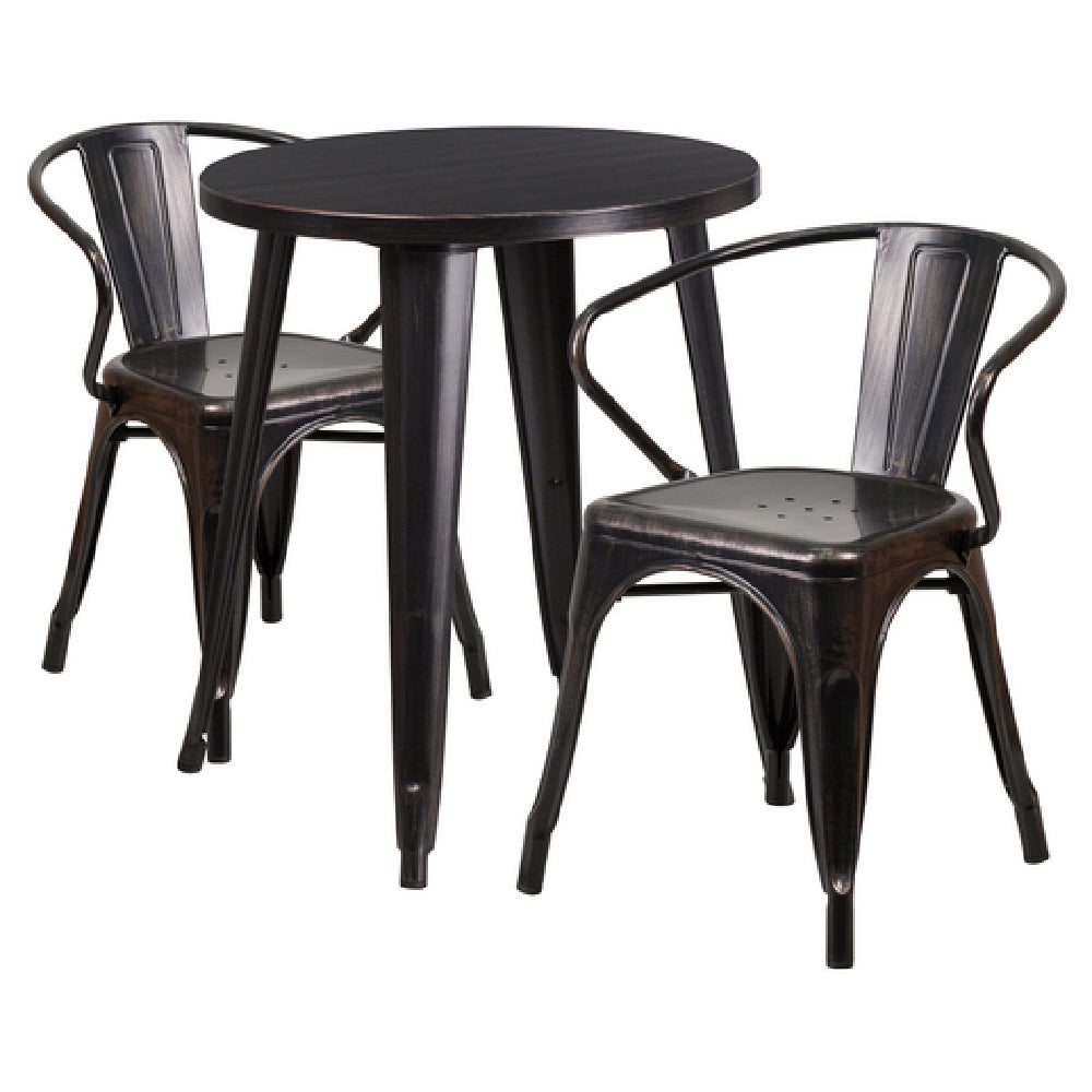 The Flash Furniture CH-51080TH-2-18ARM-BQ-GG Table And Chair Set includes a robust 24-inch diameter table with a 29-inch height, featuring a round and smooth top along with a 1-1/4-inch thick edge. Designed for durability, this table incorporates a brace underneath the top for enhanced stability. Accompanying the table are two chairs, each measuring 21-1/2 inches in width, 19 inches in depth, and 27-3/4 inches in height. These chairs are thoughtfully designed with a curved back and vertical slat, offering both style and comfort. Additional features include integrated arms and drain holes in the seat for practicality. Each chair is reinforced with a cross brace under the seat, ensuring lasting support. The set is constructed from metal and finished with a powder coat, accentuated by black and antique gold coloring, making it suitable for both indoor and outdoor use in commercial and residential settings. Equipped with rubber floor glides, this furniture set protects surfaces while maintaining stability. Assembly is required, and the set is conveniently shipped in two boxes. This product is typically ready for shipment within 24 hours when in stock, catering to diverse market needs with its blend of style, functionality, and reliability.
