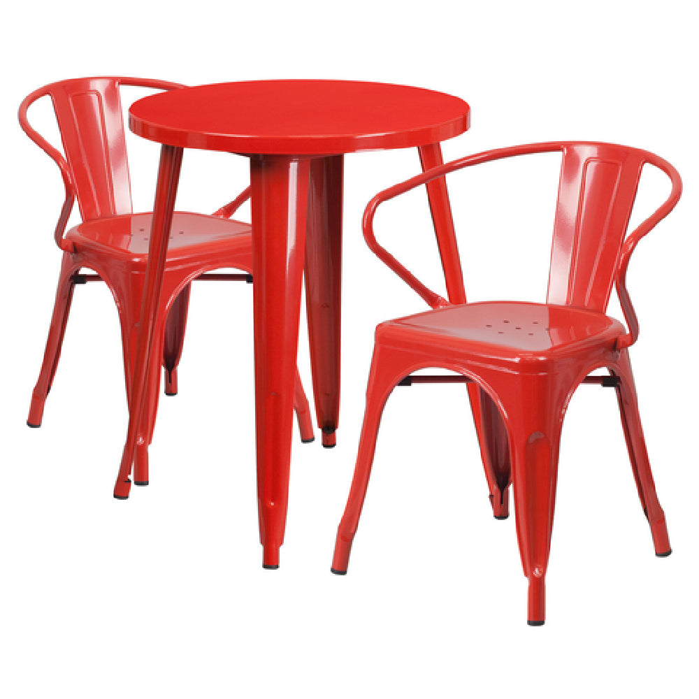 The Flash Furniture CH-51080TH-2-18ARM-RED-GG Table And Chair Set offers a compact and versatile dining solution with an emphasis on durability and style. This set includes a round table with a 24-inch diameter and 29-inch height, featuring a smooth top with a 1-1/4 inch thick edge, reinforced by a brace underneath for added stability. Accompanying the table are two chairs, each measuring 21-1/2 inches in width, 19 inches in depth, and 27-3/4 inches in height. These chairs are designed with a curved back and vertical slat, integrated arms, and seat drain holes, ensuring comfort and practicality. A cross brace under the seat enhances stability. Constructed entirely of metal with a powder coat finish, the set is suitable for both indoor and outdoor use, making it a flexible choice for commercial and residential environments. The inclusion of rubber floor glides ensures floor protection during use. Shipped in two boxes, assembly is required, and in-stock items typically ship within 24 hours. This red set is not only visually appealing but also offers a functional and durable solution for a variety of settings, from quaint cafes to home patios, with its robust design and striking color.