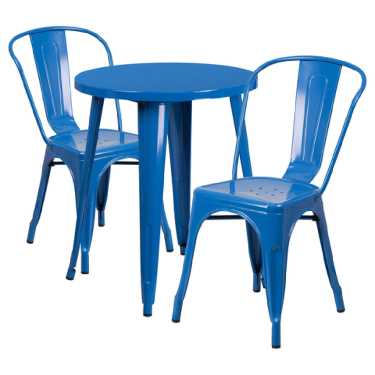 Flash Furniture CH-51080TH-2-18CAFE-BL-GG Table and Chair Set is a versatile ensemble designed for both indoor and outdoor use, making it suitable for a variety of settings. The set includes a round table with a 24-inch diameter and a height of 29 inches, featuring a smooth, 1-1/4-inch thick top with a brace underneath for enhanced stability. Accompanying the table are two chairs, each measuring 18 inches in width, 20 inches in depth, and 33 inches in height. The chairs are designed with a curved back and vertical slat, providing ergonomic support and comfort. Additionally, the chairs feature drain holes in the seat and a cross brace underneath for added strength. Constructed from metal with a durable powder coat finish, the set is equipped with rubber floor glides to protect surfaces and facilitate easy movement. This table and chair set is shipped in two boxes, with assembly required upon delivery. Its robust design and adaptability make it an ideal choice for commercial as well as residential environments, providing a stylish and functional seating solution that can withstand varied weather conditions and heavy use.