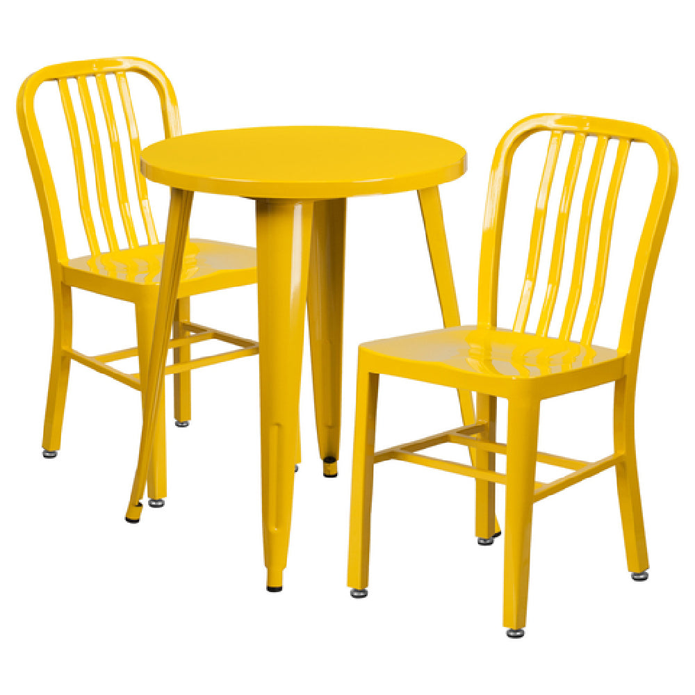 The Flash Furniture CH-51080TH-2-18VRT-YL-GG Table and Chair Set is a versatile choice for both indoor and outdoor settings, catering to commercial and residential needs. This set includes a round table with a 24" diameter and a height of 29", featuring a smooth top with a 1-1/4" thick edge and a brace underneath for added stability. The accompanying chairs, two in number, measure 15-1/2"W x 20"D x 33-1/4"H, and are designed with a vertical slat back that complements the table’s aesthetic. Constructed from metal, the set is finished with a durable powder coat in a vibrant yellow, adding a pop of color to any space. The table is equipped with rubber floor glides to protect flooring surfaces, while the chairs have adjustable floor glides to ensure stability on uneven surfaces. This table and chair set requires assembly and is shipped in two boxes. Stock items typically ship within 24 hours, ensuring a quick delivery timeframe. Ideal for cafes, patios, dining rooms, or event spaces, this product combines functionality with a bold design, making it a practical and stylish solution for diverse application areas.