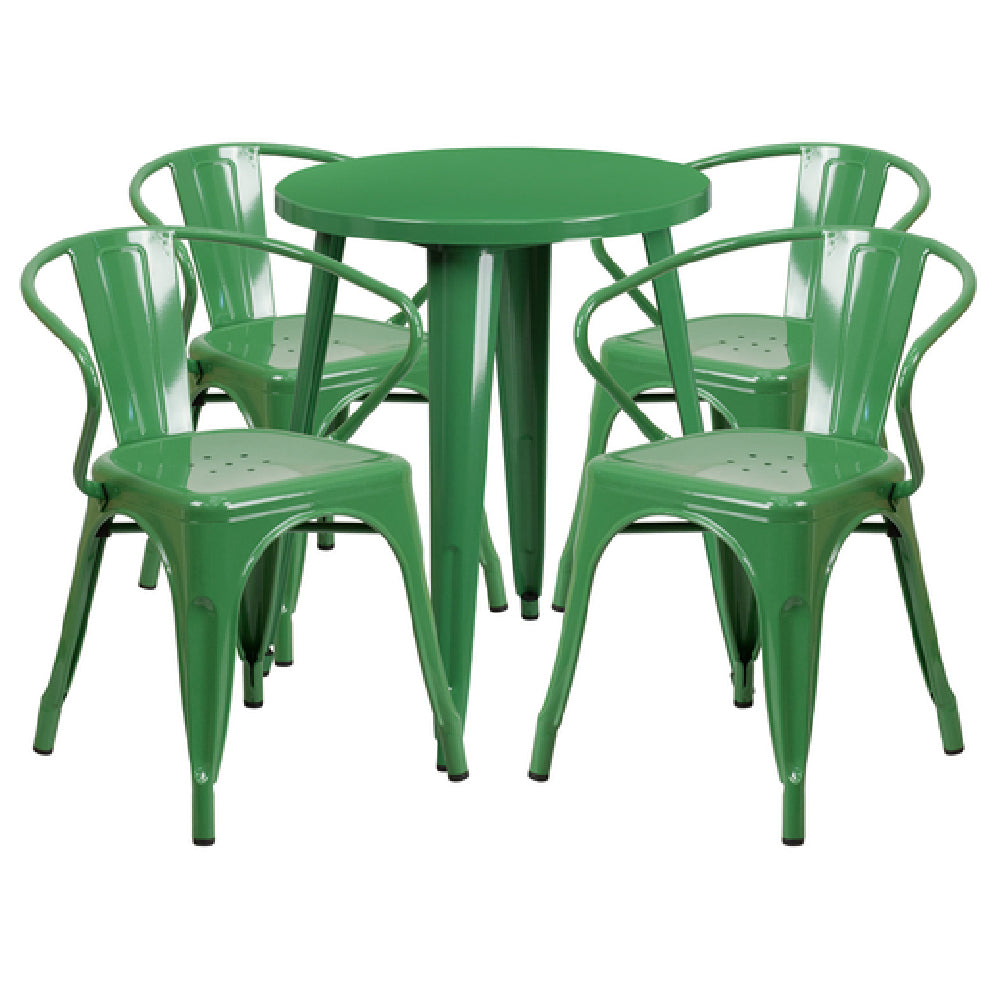 The Flash Furniture CH-51080TH-4-18ARM-GN-GG Table and Chair Set is an exceptional product designed to meet the needs of both commercial and residential spaces. This set includes a round table with a 24-inch diameter and a height of 29 inches, making it a versatile choice for a variety of settings. The table's smooth top is accompanied by a 1-1/4-inch thick edge and is supported by a brace underneath for added stability. Accompanying the table are four chairs, each measuring 21-1/2 inches in width, 19 inches in depth, and 27-3/4 inches in height. The chairs feature a curved back with a vertical slat design and integrated arms for enhanced comfort and support. Additionally, the chairs are equipped with drain holes in the seat, making them suitable for both indoor and outdoor use. Crafted from metal with a powder coat finish, this set is designed to withstand the rigors of frequent use, while rubber floor glides protect surfaces from damage. With its attractive green color and practical design, this table and chair set is shipped in two boxes and requires assembly. In-stock items typically ship within 24 hours, ensuring prompt delivery for your convenience.