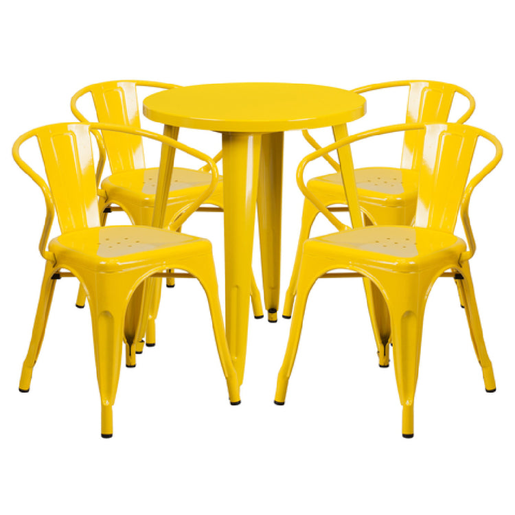Flash Furniture CH-51080TH-4-18ARM-YL-GG Table And Chair Set includes a 24" diameter x 29" height table with a round, smooth top and a 1-1/4" thick edge, supported by a brace underneath, ensuring stability and durability. Accompanying the table are four 21-1/2" wide x 19" deep x 27-3/4" height chairs, each featuring a curved back with a vertical slat design and integrated arms for enhanced comfort. The chairs also have drain holes in the seat, making them suitable for both indoor and outdoor environments, and are composed of metal with a powder coat finish, providing resistance to weathering and wear. The inclusion of rubber floor glides allows for easy movement without scratching floors, and the entire set is designed to meet the needs of both commercial and residential users, offering functionality and style. This vibrant yellow set requires assembly and is shipped in two boxes, with in-stock items typically dispatched within 24 hours, making it a convenient option for a quick refresh of dining or gathering spaces. This combination of practical features and eye-catching design makes this set a valuable addition to any setting.