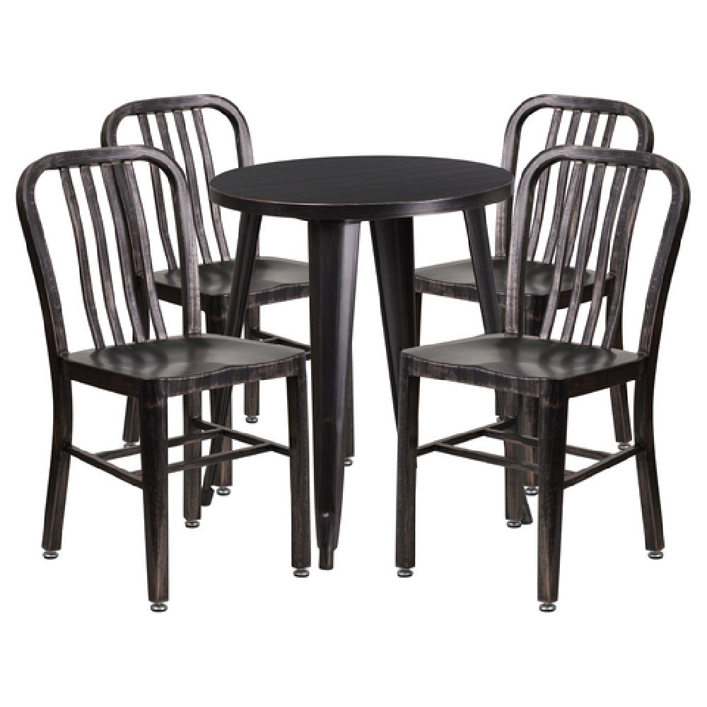 The Flash Furniture CH-51080TH-4-18VRT-BQ-GG Table And Chair Set Includes (1) 24" Dia. X 29"H Table, offering a comprehensive solution for indoor and outdoor settings with its versatile design. The table, featuring a round, smooth top with a 1-1/4" thick edge, is supported by a sturdy brace underneath, ensuring stability and durability. Complementing the table are four chairs, each measuring 15-1/2"W x 20"D x 33-1/4"H, designed with a vertical slat back that adds a touch of elegance. Constructed from metal with a powder coat finish, these chairs are both robust and stylish. The set includes rubber floor glides for the table and adjustable floor glides for the chairs, providing protection for various floor surfaces and ensuring adaptability to different environments. Suitable for both commercial and residential use, this black and antique gold set is shipped in two boxes and typically ships within 24 hours when in stock. Assembly is required, allowing for a customized setup. This table and chair set is an excellent choice for those seeking a balance of functionality and aesthetic appeal in diverse market segments, from hospitality to home dining spaces.