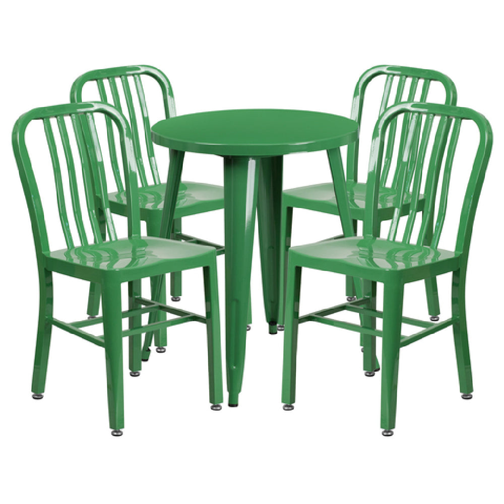 Flash Furniture CH-51080TH-4-18VRT-GN-GG Table And Chair Set is a versatile furniture solution designed for both commercial and residential environments. This set features a durable 24-inch diameter table with a 29-inch height and a smooth, round top supported by a 1-1/4-inch thick edge and a brace underneath for added stability. Complementing the table are four metal chairs, each with a vertical slat back design, measuring 15-1/2 inches wide, 20 inches deep, and 33-1/4 inches high. The chairs and table are finished with a powder coat that enhances their durability and resistance to wear. Rubber floor glides on the table and adjustable floor glides on the chairs ensure stability and protect your floors from scratches. The set is suitable for indoor and outdoor use, providing flexibility and style to various settings such as patios, cafes, or dining rooms. Its vibrant green color adds a pop of color to any space. Assembly is required, and the product is shipped in two boxes. For convenience, in-stock items typically ship within 24 hours, making this set a practical choice for those seeking efficiency and functionality in their furniture purchases.