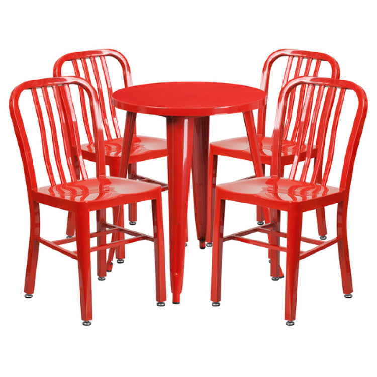 The Flash Furniture CH-51080TH-4-18VRT-RED-GG Table And Chair Set includes a 24-inch diameter by 29-inch high round table with a smooth top and 1-1/4-inch thick edge, reinforced by a brace underneath for added stability. This set also features four chairs, each measuring 15-1/2 inches wide, 20 inches deep, and 33-1/4 inches high, with a vertical slat back design. Constructed from metal with a durable powder coat finish, this set is engineered for both indoor and outdoor use, making it suitable for a wide range of environments such as residential patios or commercial dining spaces. The table is equipped with rubber floor glides, while each chair includes adjustable floor glides, ensuring stability on various surfaces. Available in a vibrant red color, this stylish set requires assembly and is conveniently shipped in two boxes. Typically, in-stock items are dispatched within 24 hours, ensuring a prompt delivery. The combination of durability, aesthetic appeal, and practicality makes this table and chair set a versatile choice for those seeking adaptable furniture solutions. Its robust construction and thoughtful design cater to diverse market segments, enhancing any setting with its functional elegance.