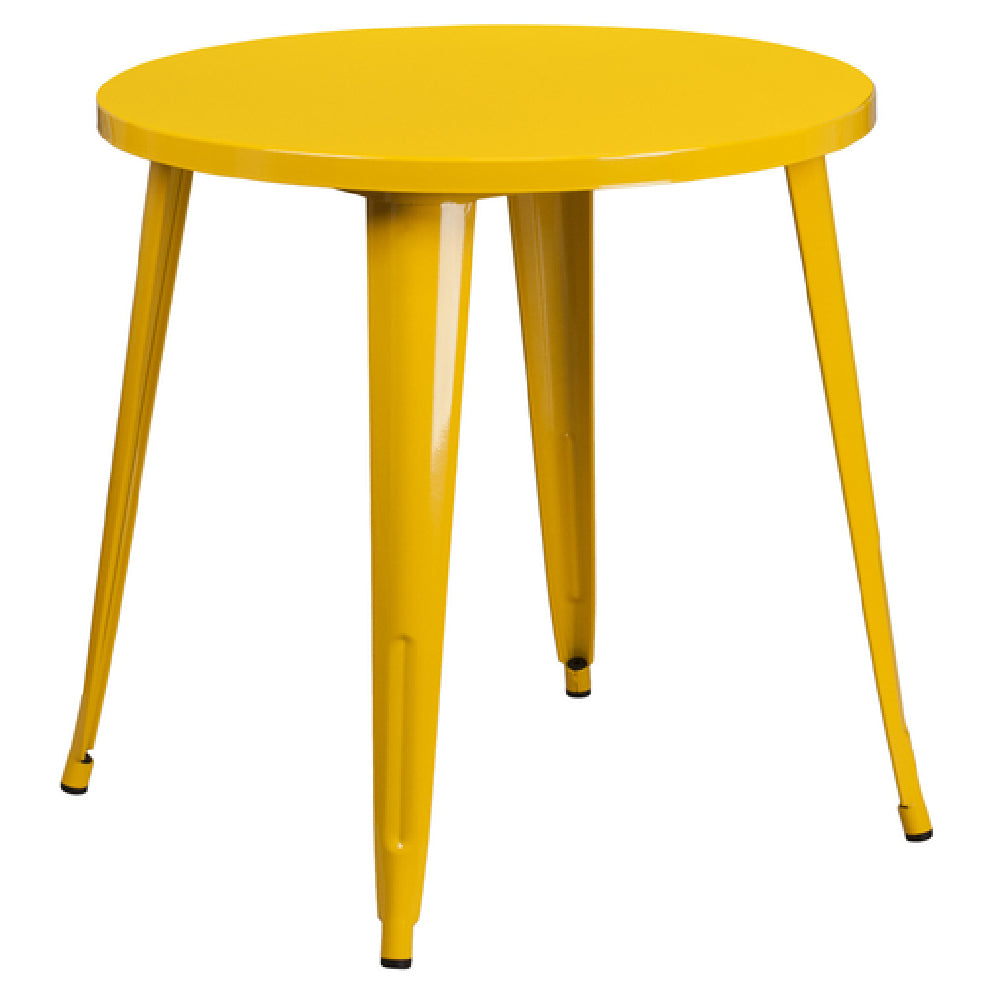 The Flash Furniture CH-51090-29-YL-GG Table 30" Dia. X 29-1/2"H Dining Height is a versatile piece designed to enhance both commercial and residential spaces. This round table features a smooth top with a 1-1/4" thick edge, providing a sturdy and stylish surface for dining or gathering. The table's dimensions, 30 inches in diameter and 29-1/2 inches in height, make it ideal for dining settings. Supported by a brace underneath the top, it ensures stability and durability. Constructed from metal with a vibrant yellow powder coat finish, this table is built to withstand indoor and outdoor environments while adding a pop of color. Equipped with rubber floor glides, it protects floors from scratches and scuffs, making it suitable for high-traffic areas. This product requires assembly upon delivery, and in-stock items typically ship within 24 hours, allowing for quick setup. Whether placed in a bustling café, a cozy home dining room, or an outdoor patio, the Flash Furniture CH-51090-29-YL-GG Table combines functionality and aesthetics, catering to the needs of various market segments seeking quality and style in their furniture choices.