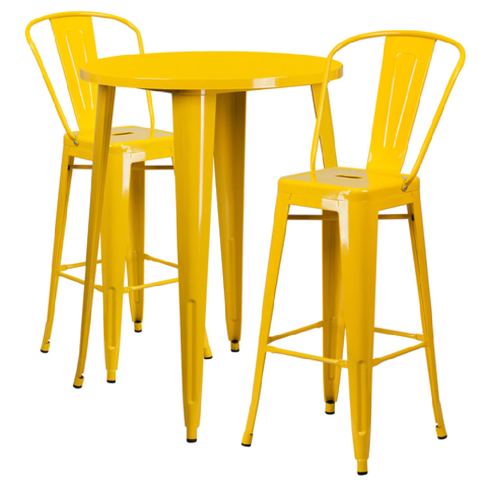 The Flash Furniture CH-51090BH-2-30CAFE-YL-GG Table And Bar Stool Set is a versatile and stylish addition to any setting, featuring a 30-inch diameter by 41-inch height round table, perfectly suited for bar-height environments. This set is designed with durability in mind, featuring a smooth top with a 1-1/4-inch thick edge and a brace underneath for added support, making it ideal for both commercial and residential use. Accompanying the table are two bar stools measuring 17-3/4 inches wide by 20 inches deep by 45-1/4 inches high, each equipped with a curved back and vertical slats for comfortable seating. The stools also include thoughtfully designed drain holes in the seat for ease of maintenance, a cross brace under the seat for stability, and a convenient footrest. Constructed from metal with a powder coat finish, this set is protected against the elements, ensuring suitability for indoor and outdoor use. The rubber floor glides enhance stability and protect flooring surfaces. Available in a vibrant yellow, this set requires assembly and is shipped in two boxes, usually dispatching within 24 hours for quick access. This product delivers exceptional value through its robust construction and thoughtful design, catering to diverse market needs.