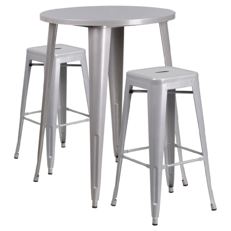 The Flash Furniture CH-51090BH-2-30SQST-SIL-GG Table and Bar Stool Set consists of a 30-inch diameter by 41-inch height round table and two bar-height stools, designed for both commercial and residential use. This set features a smooth table top with a 1-1/4 inch thick edge, supported by a brace underneath for enhanced stability, making it suitable for indoor and outdoor environments. The bar stools are backless with square seats, each equipped with drain holes and a supportive cross brace under the seat, ensuring durability and ease of maintenance. A footrest is integrated into the stool design for added comfort. Crafted from metal with a sleek powder coat finish in silver, this set is both stylish and practical. Rubber floor glides are included, providing protection for flooring surfaces. Assembly is required, and the product is shipped in two boxes with typically quick shipping within 24 hours. This table and bar stool set is an excellent choice for those seeking a functional and modern seating solution for a variety of settings.