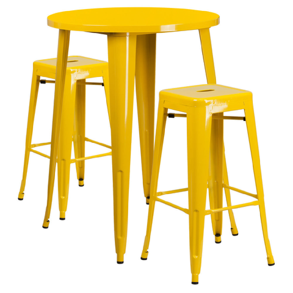 The Flash Furniture CH-51090BH-2-30SQST-YL-GG Table And Bar Stool Set includes a 30-inch diameter by 41-inch high table, designed with a bar height and smooth round top, featuring a 1-1/4-inch thick edge and a brace underneath for enhanced stability. Accompanying the table are two backless bar stools, each with a square seat that includes drain holes for added practicality. These stools are reinforced with a cross brace under the seat and a convenient footrest, ensuring comfort and durability. Constructed from metal with a robust powder coat finish, this set is suitable for both indoor and outdoor use, catering to commercial and residential settings. The inclusion of rubber floor glides aids in protecting flooring surfaces while ensuring ease of movement. Notably, this vibrant yellow set requires assembly, and items are shipped in two boxes. In-stock items generally ship within 24 hours, making it a versatile and readily available option for various market segments seeking durable and attractive seating solutions.