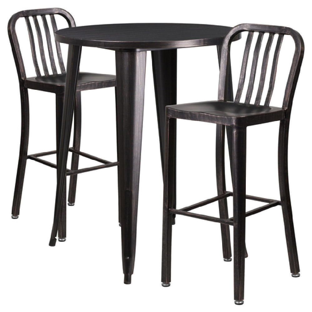 Flash Furniture CH-51090BH-2-30VRT-BQ-GG Table and Bar Stool Set features a bar height round table with a smooth 30-inch diameter top, standing 41 inches tall and supported by a 1-1/4 inch thick edge with a brace underneath for added stability. The set includes two bar stools, each measuring 15-1/2 inches wide, 20 inches deep, and 43 inches high, equipped with vertical slat backs and footrests. Crafted from robust metal with a powder coat finish, this set is designed for both indoor and outdoor use, catering to both commercial and residential environments. The table is fitted with rubber floor glides, while the bar stools come with adjustable floor glides, ensuring stability and surface protection on various floor types. This versatile furniture assembly, in stylish black and antique gold, requires some assembly and is conveniently shipped in two boxes, often dispatched within 24 hours for speedy delivery. This set's sturdy construction and adaptable design make it an excellent addition for various settings, from casual home bars to vibrant commercial spaces, providing both functionality and an attractive aesthetic.
