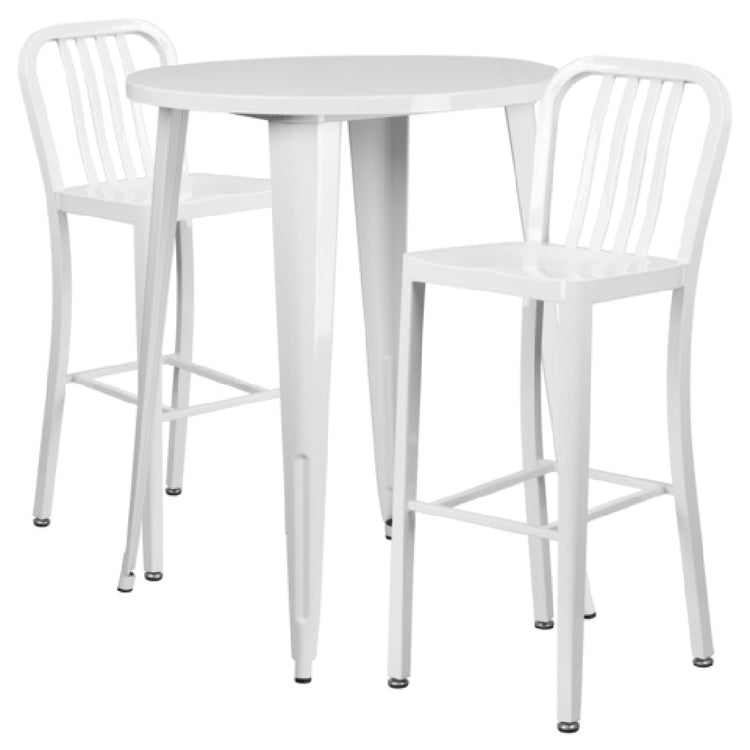 The Flash Furniture CH-51090BH-2-30VRT-WH-GG Table and Bar Stool Set is a versatile and stylish addition to any indoor or outdoor space, catering to both commercial and residential needs. This set includes one 30-inch diameter by 41-inch height round table, which features a smooth top with a 1-1/4-inch thick edge supported by a brace underneath for enhanced stability. Accompanying the table are two bar stools measuring 15-1/2 inches in width, 20 inches in depth, and 43 inches in height, featuring vertical slat backs and footrests for added comfort. The set is constructed from durable metal with a powder coat finish, offering a sleek and modern appearance. Rubber floor glides on the table and adjustable floor glides on the bar stools ensure stability on various surfaces, making it suitable for diverse environments. Designed for easy assembly and shipping in two boxes, this set usually ships within 24 hours of order placement, highlighting its practicality and convenience. The Flash Furniture CH-51090BH-2-30VRT-WH-GG set is available in a classic white color, providing a neutral and adaptable aesthetic that complements various decor styles.