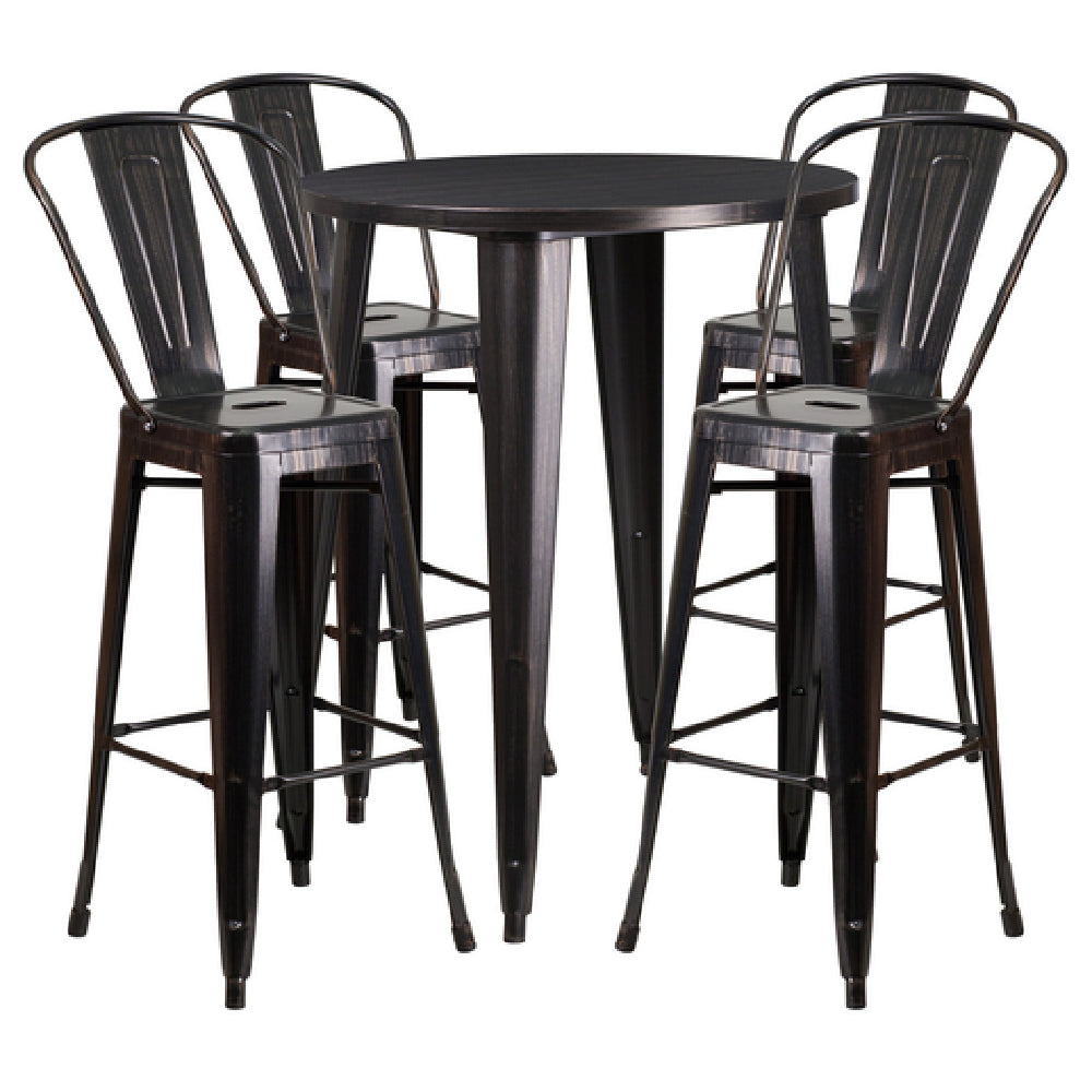 The Flash Furniture CH-51090BH-4-30CAFE-BQ-GG Table and Bar Stool Set is a meticulously designed ensemble ideal for both commercial and residential settings. This set includes a 30-inch diameter by 41-inch height table, tailored for a bar-height experience with a smooth, round top and a 1-1/4-inch thick edge, supported by a brace underneath for enhanced stability. Accompanying the table are four bar stools, each measuring 17-3/4 inches wide, 20 inches deep, and 45-1/4 inches high. The stools feature a curved back with a vertical slat design, offering ergonomic support and style. Practical drain holes in the seat facilitate easy cleaning, while a cross brace under each seat adds extra reinforcement. For user comfort, each stool is equipped with a footrest. Constructed from durable metal with a powder coat finish, the set is designed for longevity and is suitable for indoor and outdoor use. Additionally, rubber floor glides protect surfaces from scratches. The set is finished in an attractive combination of black and antique gold, requiring some assembly upon receipt. Shipped in two boxes, in-stock items are typically dispatched within 24 hours, ensuring prompt delivery for your seating needs.