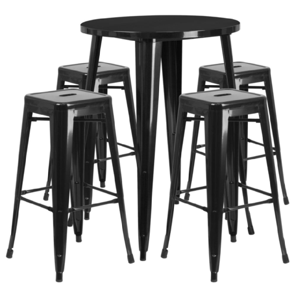 Flash Furniture, CH-51090BH-4-30SQST-BK-GG, Table and Bar Stool Set, includes (1) 30" dia. x 41"H table, bar height, round, smooth top, 1-1/4" thick edge, brace underneath top, (4) bar stools, backless, square seat with drain holes, cross brace under seat, footrest, metal, powder coat finish, rubber floor glides, designed for indoor/outdoor commercial and residential use, black (assembly required) (shipped in 2 boxes) (in stock items usually ship within 24 hours)