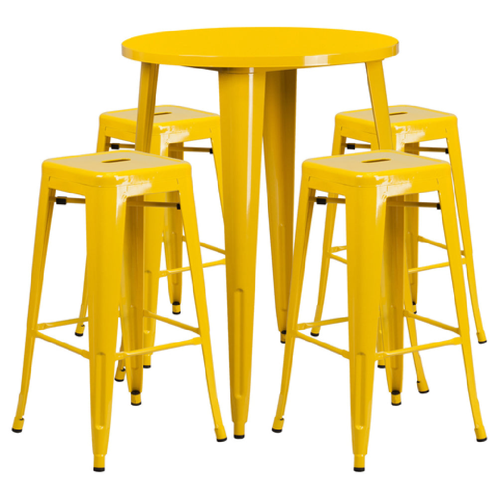 The Flash Furniture CH-51090BH-4-30SQST-YL-GG Table and Bar Stool Set is a comprehensive seating solution, meticulously designed for diverse environments, both residential and commercial. The set includes one table with a 30-inch diameter and a height of 41 inches, perfectly catering to bar-height requirements. The table's round, smooth top is accentuated by a 1-1/4 inch thick edge and a supportive brace underneath, ensuring stability and durability. Accompanying the table are four backless bar stools, each featuring a square seat equipped with drain holes for enhanced functionality. The stools are designed with a cross brace under the seat and a footrest, providing additional support and comfort for prolonged use. Constructed from metal, the entire set boasts a resilient powder coat finish, contributing to its robust design and suitability for both indoor and outdoor settings. Rubber floor glides are incorporated to protect surfaces from scratches. Available in a vibrant yellow color, this set requires assembly and is shipped in two boxes. In-stock items typically ship within 24 hours, offering a quick turnaround for buyers. This versatile set addresses the needs of various market segments, from hospitality venues to home dining spaces.